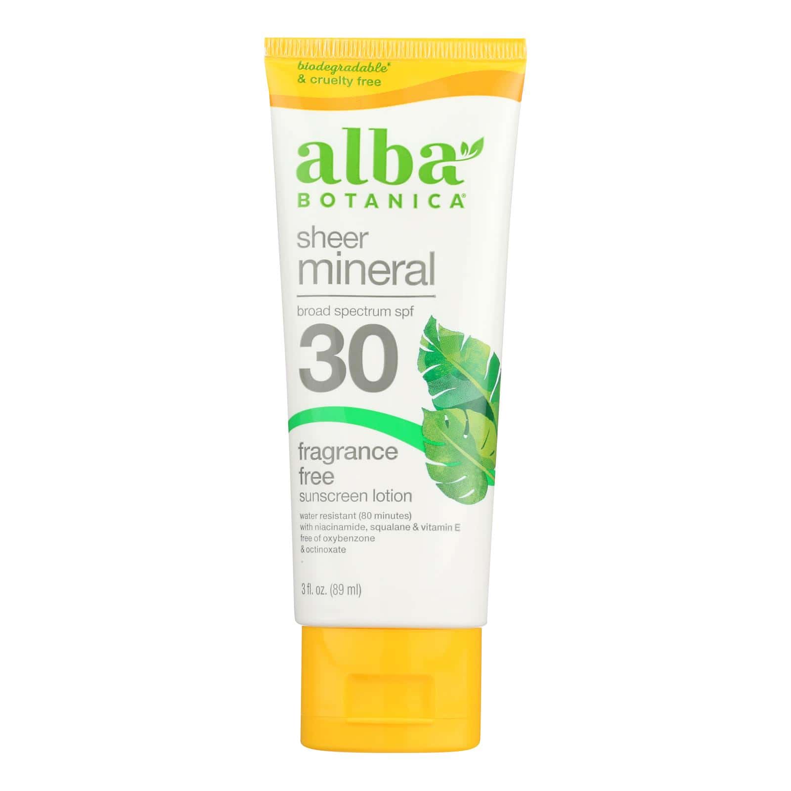 ALBA BOTANICA FRAGRANCE FREE SPF 30 VERY EMOLLIENT MINERAL SUNSCREEN PROVIDES BROAD SPECTRUM UVA/UVB PROTECTION AGAINST SUNBURN, SKIN CANCER AND PREMATURE SIGNS OF AGING. THIS FAST ABSORBING SUNSCREEN IS WATER RESISTANT AND MOISTURIZING. THIS PRODUCT CONTAINS NO ARTIFICIAL COLORS, PARABENS, PHTHALATES OR HARSH SULFATES. OUR SUNSCREEN IS MADE OF 100% VEGETARIAN INGREDIENTS, NOT TESTED ON ANIMALS AND IS CORAL REEF SAFE. INCLUDES ONE 4 OZ. CONTAINER OF ALBA BOTANICA FRAGRANCE FREE SPF 30 VERY EMOLLIENT MINERAL SUNSCREEN.