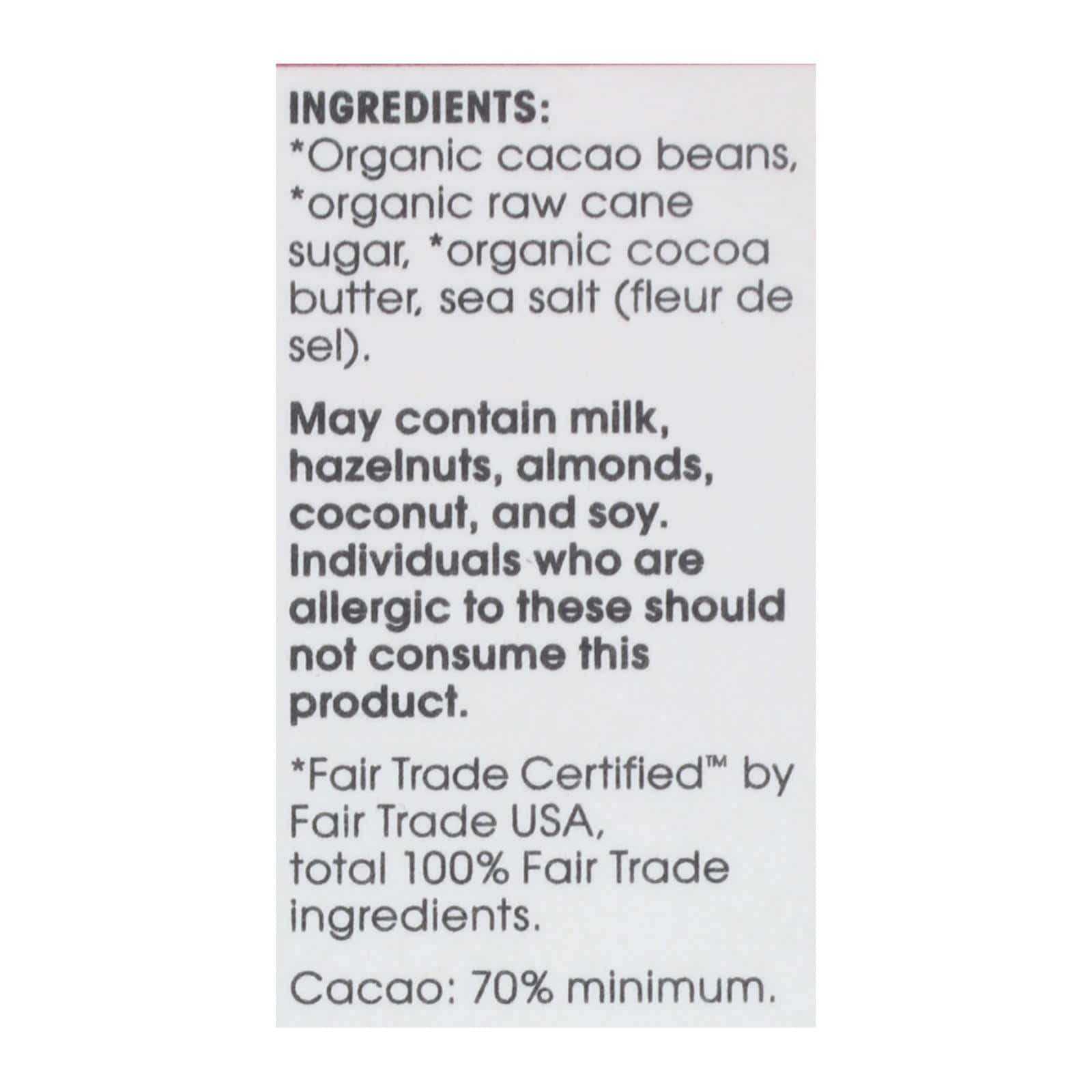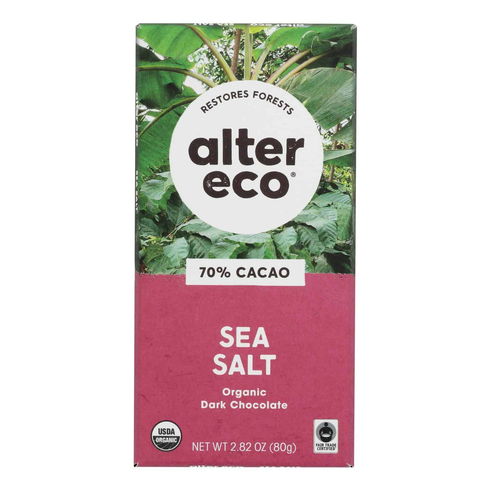 ALTER ECO’S DEEP DARK SEA SALT ORGANIC CHOCOLATE BAR IS RICH, BOLD, AND SALTY SWEET. THE FINEST BALANCE OF 70% CACAO AND FLEUR DE SEL DE GU?RANDE, WE USE SINGLE ORIGIN CACAO FROM ECUADOR AND 4 SIMPLE INGREDIENTS. OUR CHOCOLATE BAR USES 99.5% ORGANIC NATURAL INGREDIENTS AND 100% FAIR TRADE CERTIFIED INGREDIENTS. OUR SEA SALT IS HAND-HARVESTED FROM ANCIENT SALT VILLAGES. OUR CHOCOLATE IS NON-GMO PROJECT CERTIFIED AND GLUTEN FREE WHILE STAYING VEGAN. THERE ARE 220 CALORIES IN EVERY SERVING. WE WORK HARD TO OBTAIN INGREDIENTS WITH ENVIRONMENTALLY FRIENDLY METHODS AND TO REDUCE OUR CARBON FOOTPRINT. NOURISHING FOODIE, FARMER AND FIELD THROUGH SUSTAINABLE FOODS FROM AROUND THE WORLD.