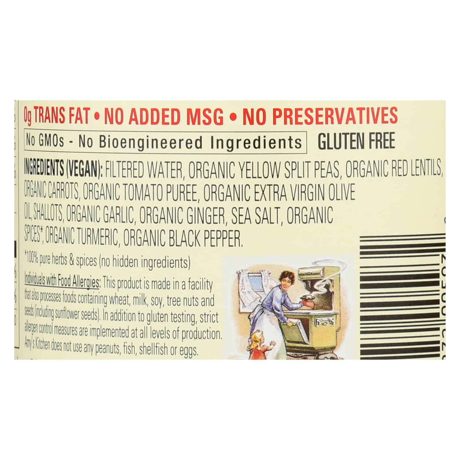 AMY’S ORGANIC GOLDEN LENTIL INDIAN DAL SOUP IS A TREAT FOR THOSE LOOKING TO RECONNECT WITH NATURAL, SIMPLE INGREDIENTS. GENTLY COOKED WITH ORGANIC VEGETABLES AND TRADITIONAL SPICES, THIS SOUP IS FILLED WITH THE ESSENCE OF HIMALAYAN FLAVOR. OUR 14.4 OZ. RECIPE IS CRAFTED WITH ORGANIC YELLOW SPLIT PEAS, RED LENTILS, CARROTS AND TOMATO PUREE. EACH CAN OF GLUTEN-FREE SOUP CONTAINS ABSOLUTELY NO PRESERVATIVES WHILE BEING PACKED WITH 5 GRAMS OF DIETARY FIBER AND 9 GRAMS OF PROTEIN PER SERVING. OUR SOUP IS NON-GMO AND IS PACKAGED IN NON-BPA LINED CANS, SO YOU CAN BE SURE THAT WHAT YOU GET IS THE REAL DEAL. SEE NUTRITIONAL FACTS PANEL FOR ALLERGENS. AMY?S KITCHEN HAS GROWN BEYOND THE BERLINER FAMILY?S WILDEST DREAMS, GOING FROM SEVERAL FAMILY MEMBERS PITCHING IN ANYWHERE THEY CAN, TO A WONDERFUL GROUP OF EMPLOYEES, FARMERS AND SUPPLIERS. BUT NO MATTER HOW BIG THE COMPANY GROWS, ONE THING WILL ALWAYS REMAIN THE SAME?THE FAMILY SPIRIT THAT PERMEATES EVERY DECISION MADE INSIDE OF AMY?S KITCHEN.