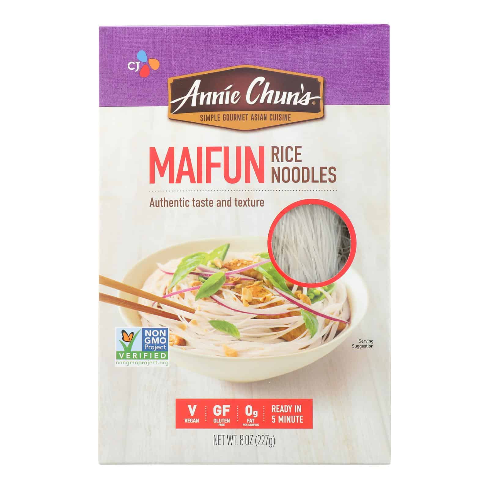 ANNIE CHUN’S MAIFUN RICE NOODLES ARE THE PERFECT WAY TO MAKE YOUR FAVORITE ASIAN DISHES AT HOME. WE HAVE CAREFULLY CRAFTED OUR NOODLES TO HAVE A DELIGHTFUL TEXTURE AND MILD FLAVOR IDEAL FOR STIR FRIES, SAVORY NOODLE SOUPS AND CHILLED NOODLE SALADS. ONLY 190 CALORIES PER SERVING. THESE NOODLES ARE GLUTEN-FREE AND VEGAN. CONTAINS ONE 8 OZ. PACKAGE. AT ANNIE CHUN’S WE BELIEVE IN DELICIOUS, EASY-TO-PREPARE, ASIAN-INSPIRED DISHES THAT YOU CAN FEEL GOOD ABOUT. WHETHER YOU WANT TO WHIP UP A QUICK PAD THAI FOR THE FAMILY, GRAB LUNCH AT THE OFFICE OR ENJOY A DELICIOUS SNACK ON THE GO, WE HAVE A FULL RANGE OF ASIAN-INSPIRED OPTIONS. IT HAS NEVER BEEN EASIER TO ENJOY THE FLAVORS OF YOUR FAVORITE ASIAN CUISINES IN THE COMFORT OF YOUR OWN HOME.