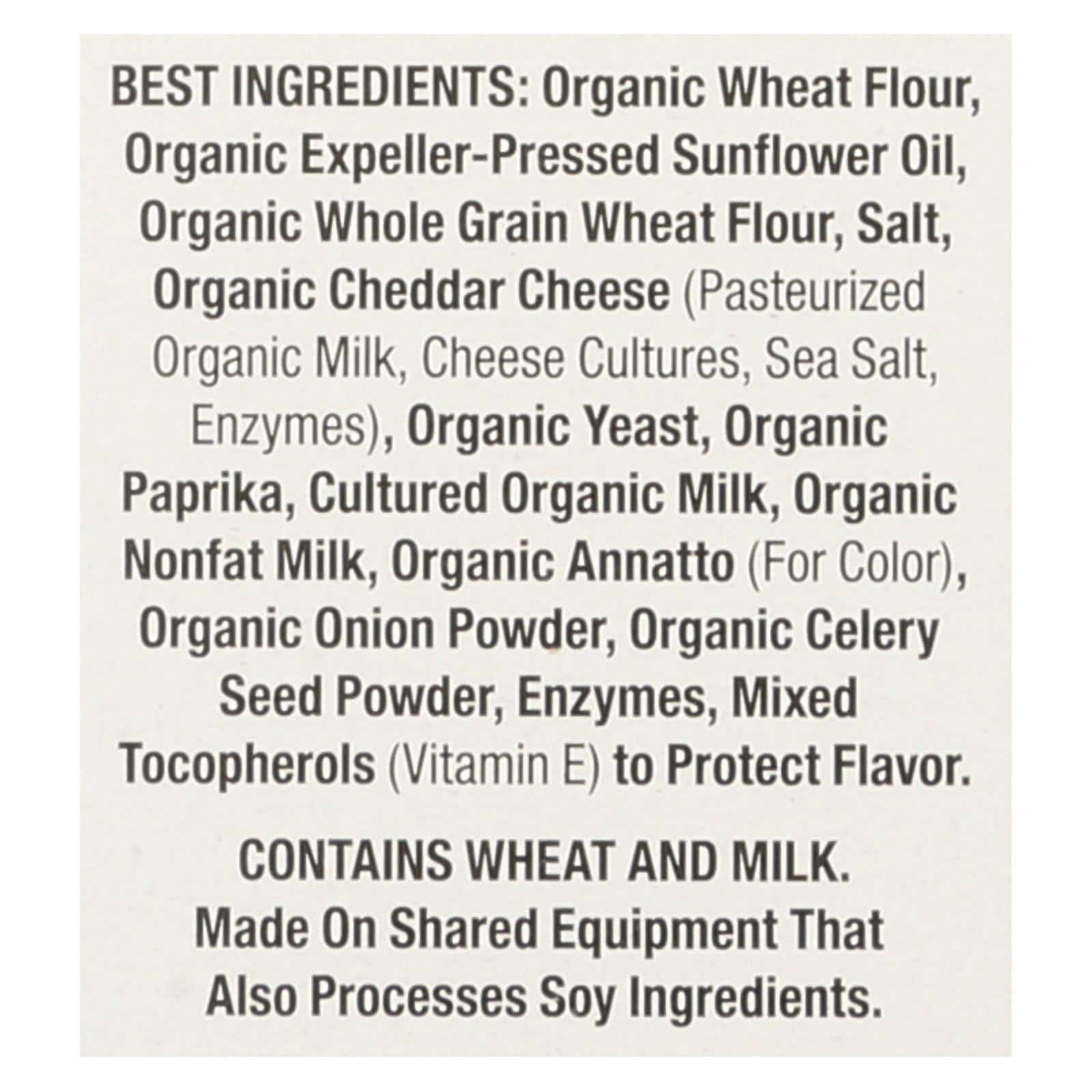 EACH 11.25 OZ. BOX OF ANNIE’S HOMEGROWN BAKED SNACK CRACKERS, CHEDDAR SQUARES CONTAINS THE BEST ORGANIC INGREDIENTS AVAILABLE THAT ARE THEN BAKED WITH REAL CHEESE. WHAT THESE CRACKERS MIX DON?T CONTAIN ARE ARTIFICIAL FLAVORS, SYNTHETIC COLORS, SYNTHETIC PRESERVATIVES, ANTIBIOTICS, SYNTHETIC HORMONES OR PERSISTENT PESTICIDES. AS A YOUNG GIRL I COULDN’T HAVE IMAGINED HOW MUCH MY LOVE FOR CHEESE WOULD DEFINE MY ADULT LIFE. FOR SNACKS, MY TASTE BUDS FAVORED THE TANGY CREAMINESS OF CHEDDAR AND THEY STILL DO. NOT SURPRISINGLY, ANNIE’S VERY FIRST PRODUCT FEATURED CHEDDAR CHEESE. TODAY, DOZENS OF ANNIE’S PRODUCTS ARE BIG ON CHEESE, INCLUDING THESE CHEDDAR SQUARES. SEE THE NUTRITION FACTS PANEL FOR ALLERGENS.