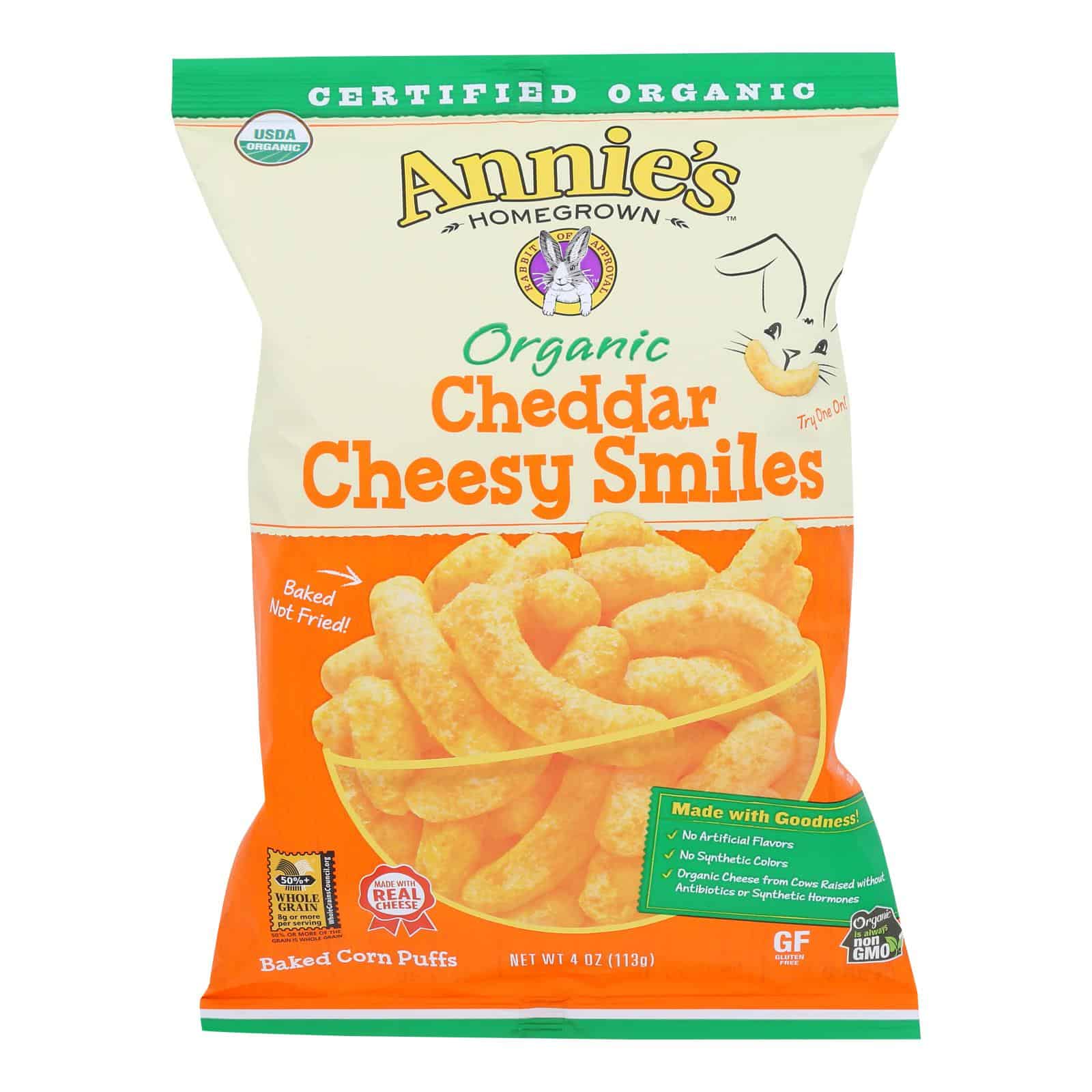 NEVER FRIED AND NEVER BORING, ANNIE’S HOMEGROWN ORGANIC CHEDDAR CHEESY PUFFS ARE A HEALTHIER SNACK THAT REALLY SATISFY. WHOLESOME AND DELICIOUS, OUR CHEESY PUFFS ALSO MAKE A DIFFERENCE IN CONSERVING BIODIVERSITY AND SUPPORTING ORGANIC FARMERS. GLUTEN-FREE, USDA CERTIFIED ORGANIC AND MADE WITH WHOLE GRAINS. ONLY NON-GMO INGREDIENTS WITH NO SYNTHETIC COLORS OR PRESERVATIVES. SEE NUTRITIONAL FACTS PANEL FOR ALLERGENS. INCLUDES ONE 4 OZ. BAG OF ANNIE’S HOMEGROWN ORGANIC CHEDDAR CHEESY PUFFS. ANNIE?S HAS A COMMITMENT TO BETTERING THE WORLD THROUGH NOURISHING FOODS, HONEST WORDS AND CONDUCT THAT IS CONSIDERATE AND KIND. FROM THE FARMS WE SOURCE OUR INGREDIENTS FROM ALL THE WAY TO THE PACKAGING OUR FOOD IS SHIPPED IN, WE ARE CONSCIOUS NOT ONLY OF YOUR HEALTH AND WELLNESS, BUT THE PLANET?S.