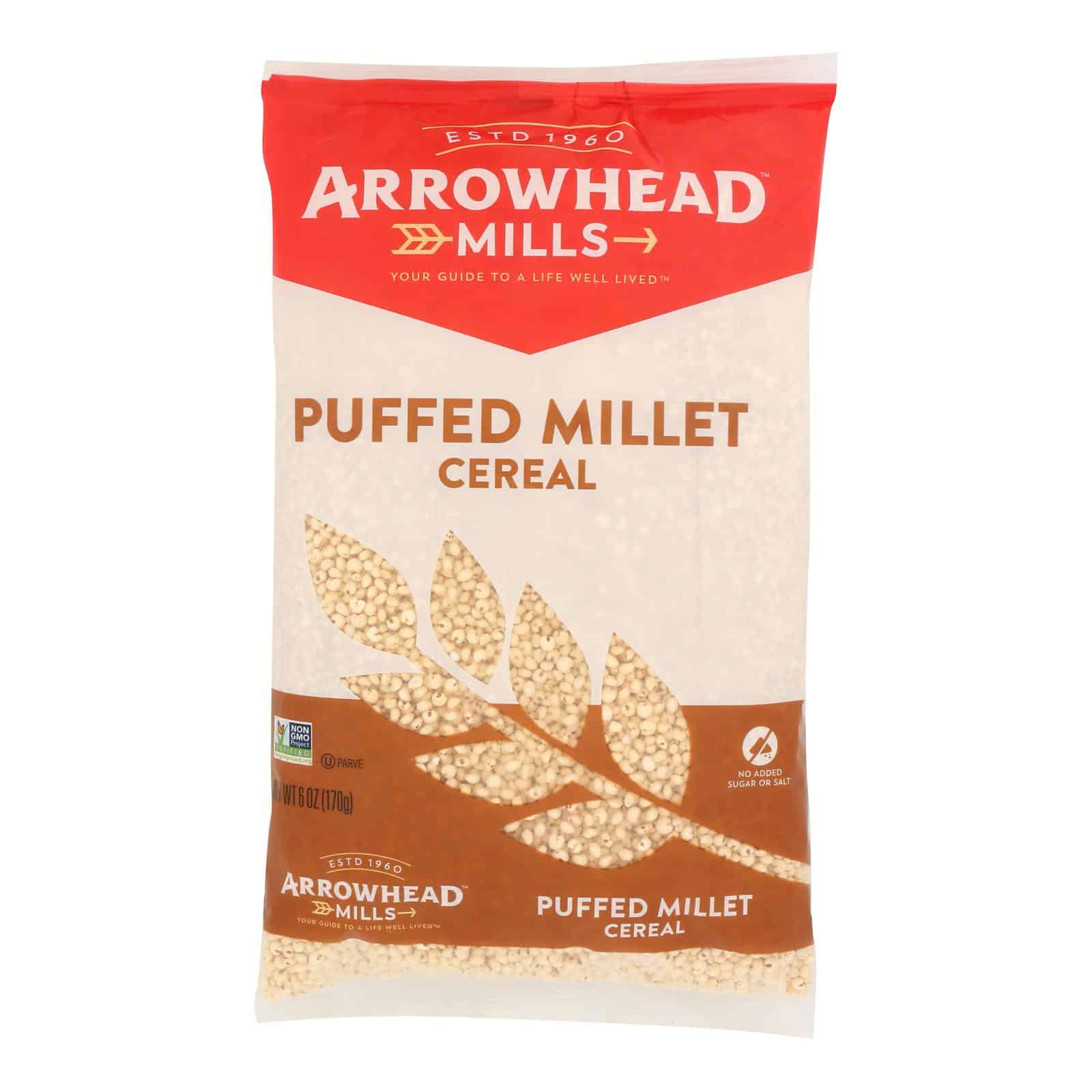ARROWHEAD MILLS NATURAL PUFFED MILLET CEREAL GIVE YOU A DELICIOUS, NUTRITIOUS START TO YOUR DAY. MILLET IS THE SMALLEST OF ALL GRAINS AND HAS BEEN USED LONGER THAN RICE OR WHEAT. IT HAS A MILD FLAVOR WITH A WHOLE LOT OF WHOLE GRAIN GOODNESS. YOU?LL GET 2 G. OF PROTEIN AND 2 G. OF FIBER PER SERVING. AND IT HAS ONLY 60 CALORIES PER SERVING. THIS ALL NATURAL PRODUCT HAS NO CHOLESTEROL AND HAS NO SUGAR OR SALT ADDED. INCLUDES ONE 6 OZ. BAG OF ARROWHEAD MILLS NATURAL PUFFED MILLET CEREAL. AS ARROWHEAD MILLS HAS GROWN, OUR BRAND AND OUR PRODUCT LINE HAVE GROWN WITH US. OVER THE YEARS, WE’VE ADDED HOT AND COLD CEREALS, AS WELL AS DELICIOUS PANCAKE, WAFFLE, CAKE AND BROWNIE MIXES; NUT BUTTERS; SEASONAL PRODUCTS; AND GLUTEN-FREE PRODUCTS?ALL OF WHICH TASTE GREAT, ARE ALL-NATURAL AND ARE ENTIRELY FREE OF CHEMICAL PESTICIDES AND HERBICIDES.