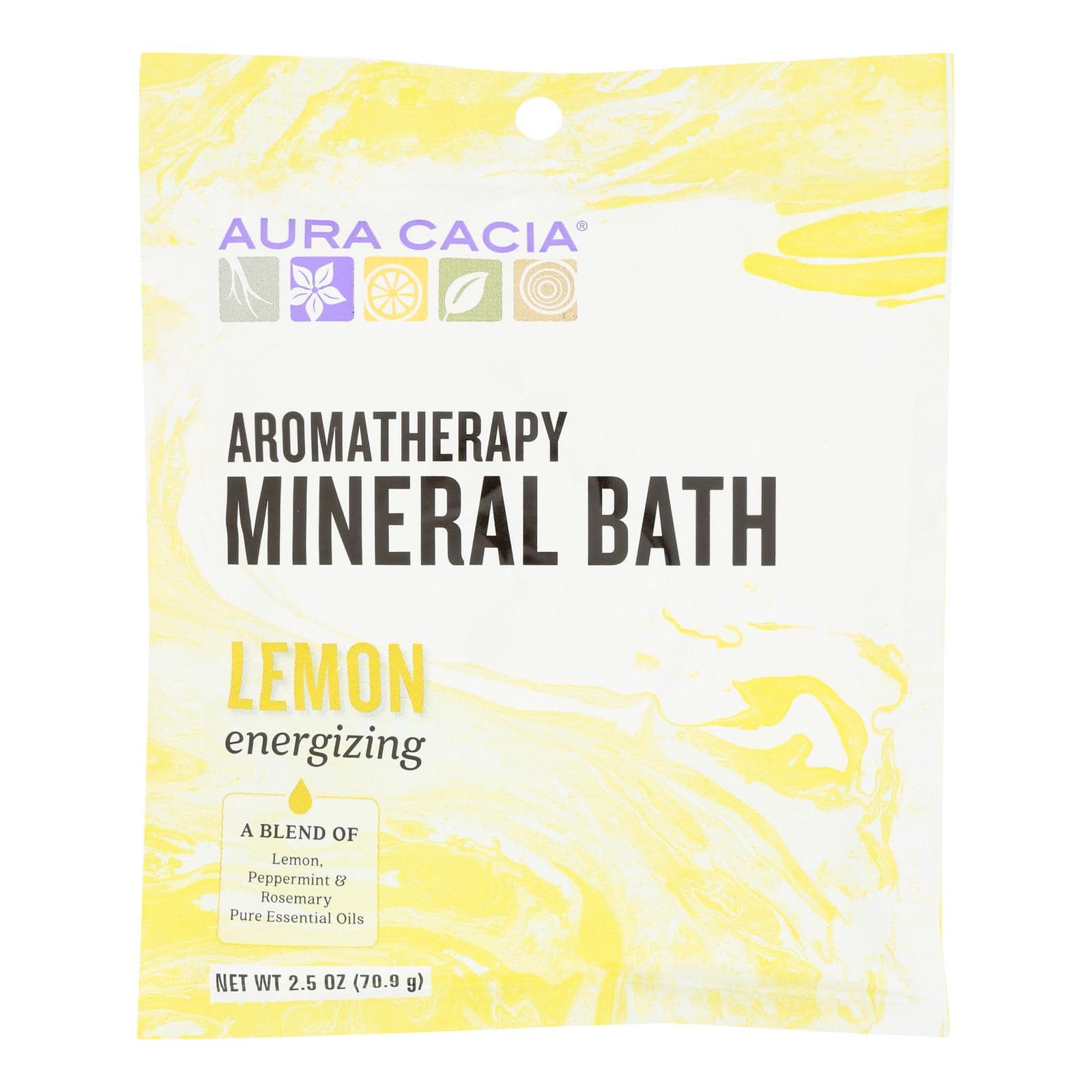 AURA CACIA ENERGIZING LEMON AROMATHERAPY MINERAL BATH IS A BLEND OF MINERALS THAT LET YOU EMERGE FROM THE SOOTHING WATERS OF YOUR TUB FEELING REFRESHED AND VELVETY SMOOTH. MADE FROM 100% PURE ESSENTIAL OILS, THIS MINERAL BATH LETS YOU CREATE AN AT-HOME SPA TREATMENT THAT ENERGIZES THE SENSES, REFRESHES THE BODY AND REVITALIZES THE SPIRIT. THIS MINERAL BATH CONTAINS THREE MAIN SCENTS: LEMON FOR ENERGIZING AND CHEERING, PEPPERMINT FOR REFRESHING AND COOLING AND ROSEMARY FOR CLARIFYING AND INVIGORATING. THIS MINERAL BATH IS NOT TESTED ON ANIMALS, IS SAFE FOR SPAS AND WHIRLPOOLS AND DOES NOT CONTAIN SYNTHETIC INGREDIENTS, PETROLEUM OR PARABENS. EACH PACKET OF AURA CACIA ENERGIZING LEMON AROMATHERAPY MINERAL BATH CONTAINS 2.5 OZ. OF PRODUCT. SEE LABEL FOR WARNINGS.