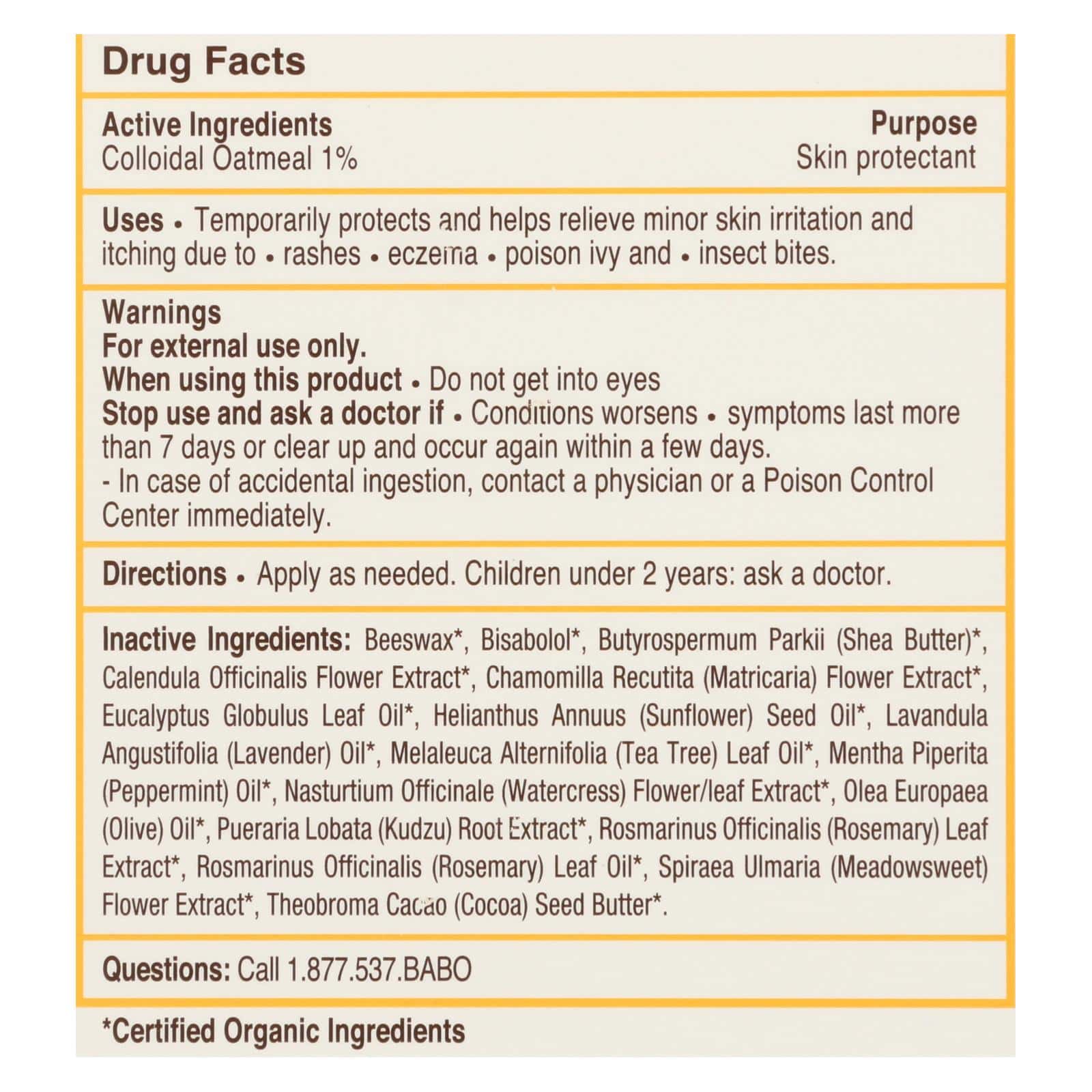 Misc: Relieves dry, chapped and itchy skin. All natural. Natural colloidal oatmeal skin protectant. Petroleum free. NSF: Contains organic ingredients. New. Natural treatment. Cracked skin, eczema, irritation & itching, chapped lips, diaper area. Head to toe relief for the most sensitive skin. Petroleum and mineral oil free, this soothing ointment helps relieve irritation due to diaper area, eczema, dry patches, cuts and scrapes. Packed with pure goodness and vitamin rich oils that calm the skin. Pediatrician tested. Dermatologist tested. Hypoallergenic. Preservative free. Gluten, soy & dairy free. Steroid free. Paraben & phthalate free. Mineral oil free. No icky chemicals. NSF: Certified to NSF/ANSI 305 by QAI (Quality Assurance International). NSF seal is a quality assurance that this product contains at least 70% organic ingredients. Certified B Corporation. Cruelty free. Nutri-Soothe: Natural complex. (hashtag)babolove. www.babobotanicals.com. Questions: Call 1.877.537.Babo. Made in the USA with US & imported ingredients.