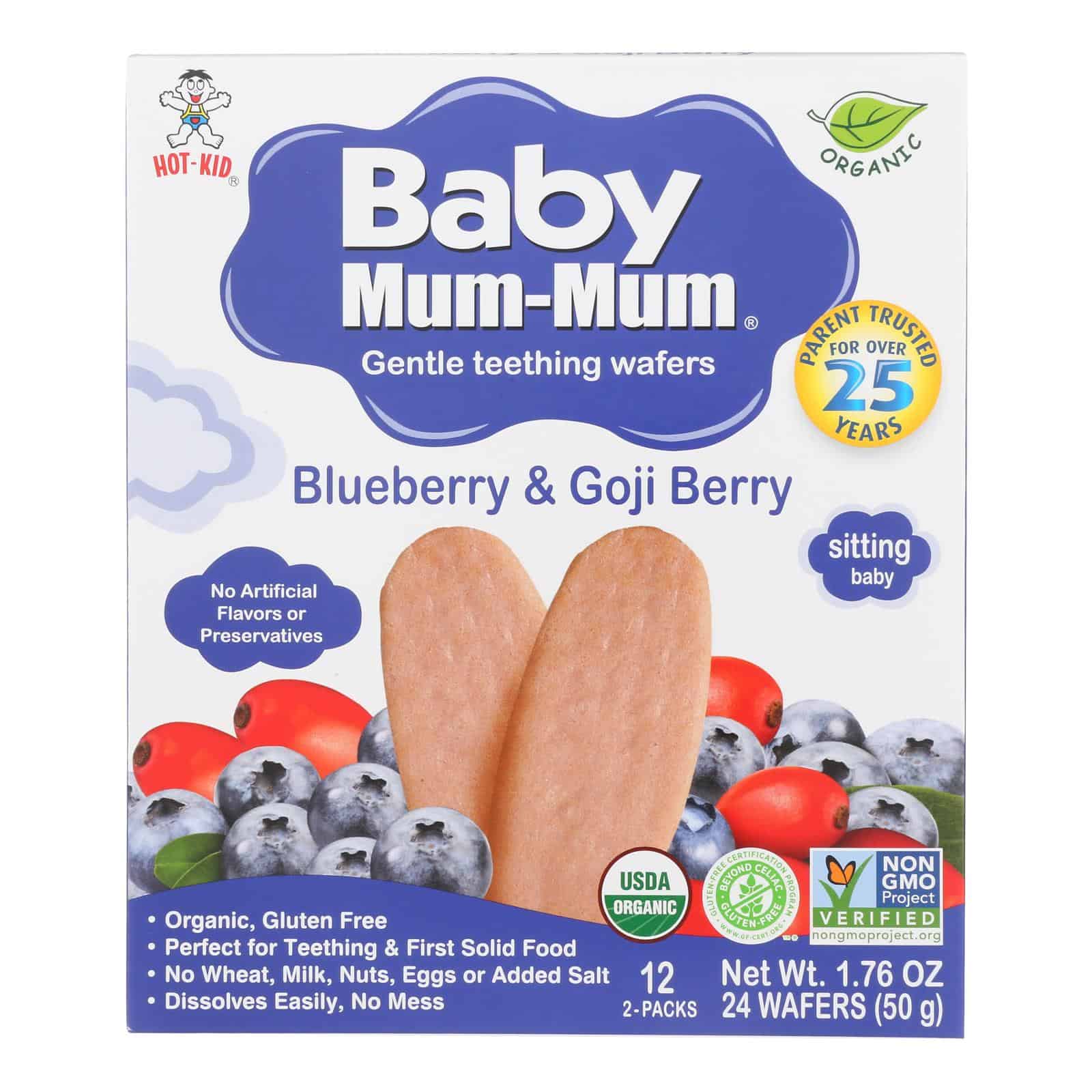 BABY MUM MUM ORGANIC BABY TEETH RICE RUSK, ORGANIC RICE SNACK WITH BLUEBERRY AND GOJI FLAVOR ARE PERFECT FOR TEETHING AND FIRST SOLID FOOD. THEY ARE CONVENIENTLY WRAPPED IN 2-PACKS. THESE RUSKS DISSOLVE EASILY. THEY ARE GLUTEN-FREE AND ORGANIC, SO WILL CONTRIBUTE TO YOUR BABY’S GOOD HEALTH. THERE ARE NO ARTIFICIAL INGREDIENTS OR PRESERVATIVES, ONLY ORGANIC RICE FLOUR, ORGANIC SUGAR, ORGANIC BLUEBERRY POWDER, ORGANIC GOJI POWDER AND OTHER NATURAL INGREDIENTS. EACH BOX CONTAINS 24 RUSKS.