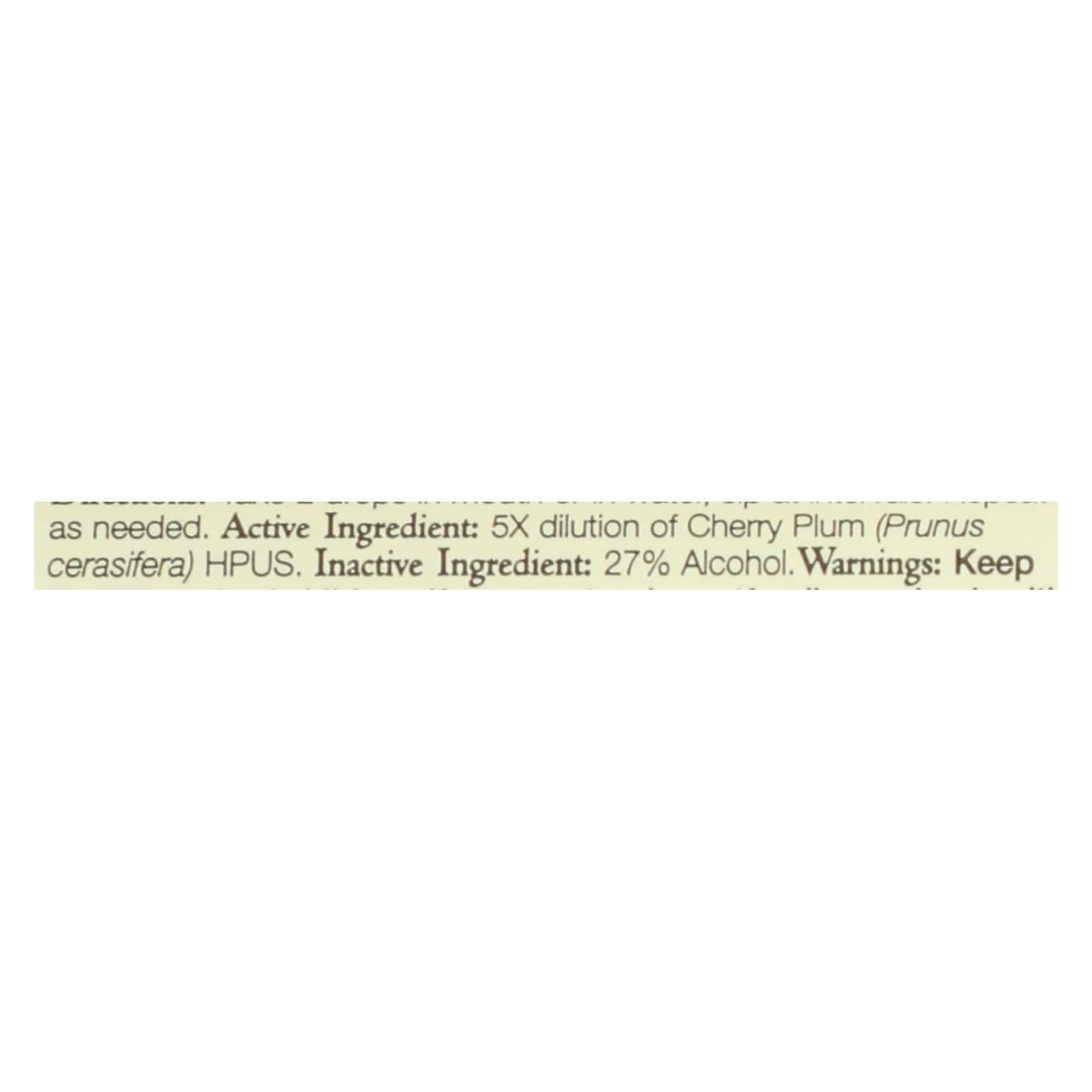 BACH CHERRY PLUM ORIGINAL FLOWER REMEDY IS FOR RELIEF OF NATURALLY OCCURRING SIMPLE NERVOUS TENSION. EACH 20 ML. BOTTLE OF OUR HOMEOPATHIC CHERRY PLUM ORIGINAL FLOWER REMEDY CONTAINS A 5X DILUTION OF CHERRY PLUM HPUS AND THE INACTIVE INGREDIENT OF 27% ALCOHOL. SEE THE PRODUCT LABEL FOR ALL USAGE AND WARNING INFORMATION.