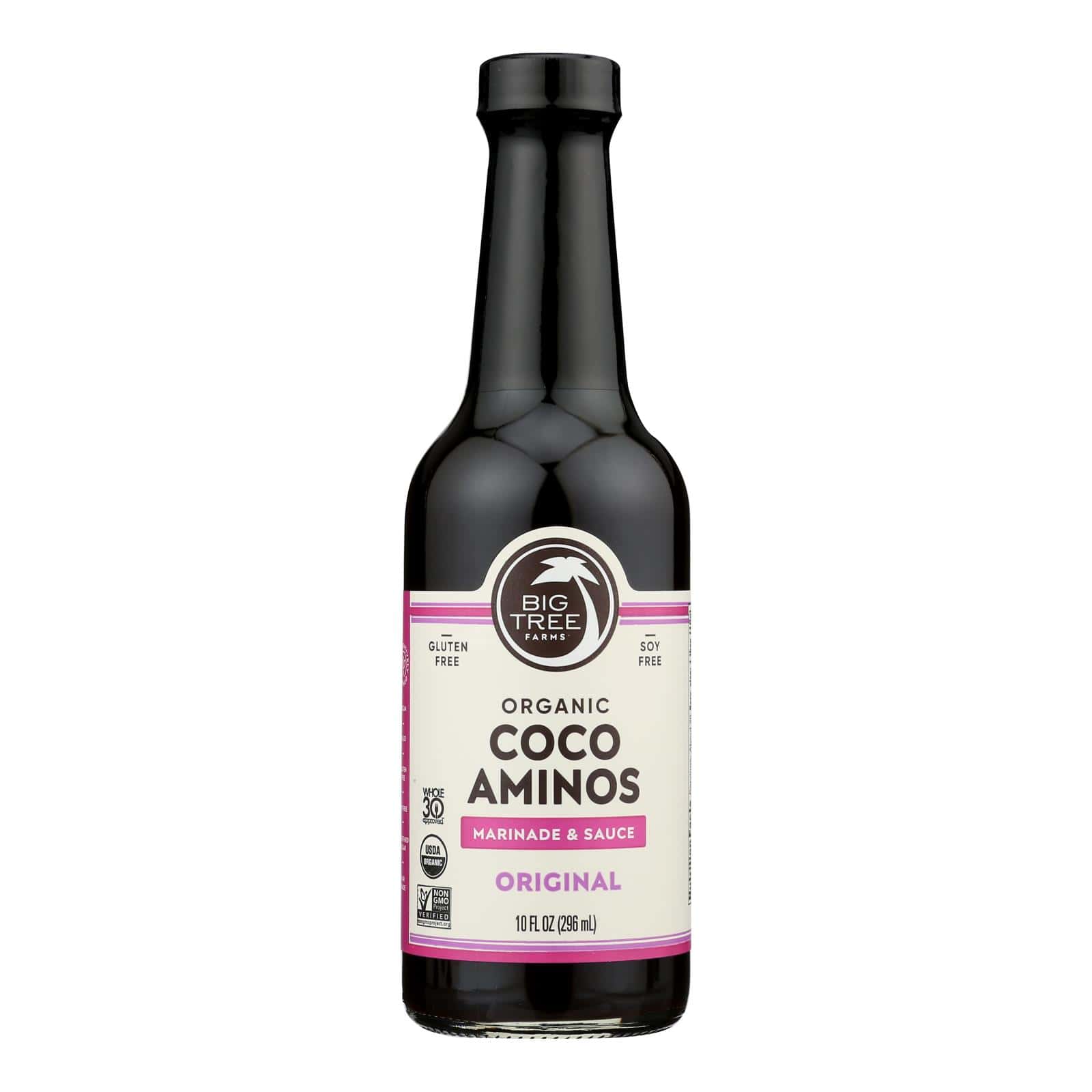 BIG TREE FARMS ORGANIC COCONUT AMINOS, SOY SAUCE ALTERNATIVE, IS A DELICIOUS SOY FREE, GLUTEN-FREE ALL PURPOSE SEASONING. THIS PRODUCT IS RICH WITH ESSENTIAL AMINO ACIDS, LOW GLYCEMIC AND CONTAINS ALMOST HALF THE SODIUM OF SOY SAUCE. BIG TREE FARMS ORGANIC COCONUT AMINOS, SOY SAUCE ALTERNATIVE IS A TANGY SAUCE GREAT FOR USE IN SALAD DRESSINGS, DIPS, ON SUSHI AND POPCORN, OR EVEN AS A TASTY MEAT OR POULTRY MARINADE. THIS PRODUCT IS ORGANIC, KOSHER, NON-GMO, AND CONTAINS NO GLUTEN. EVERY BOTTLE OF BIG TREE FARMS ORGANIC COCONUT AMINOS, SOY SAUCE ALTERNATIVE CONTAINS 10 FL. OZ. OF PRODUCT.