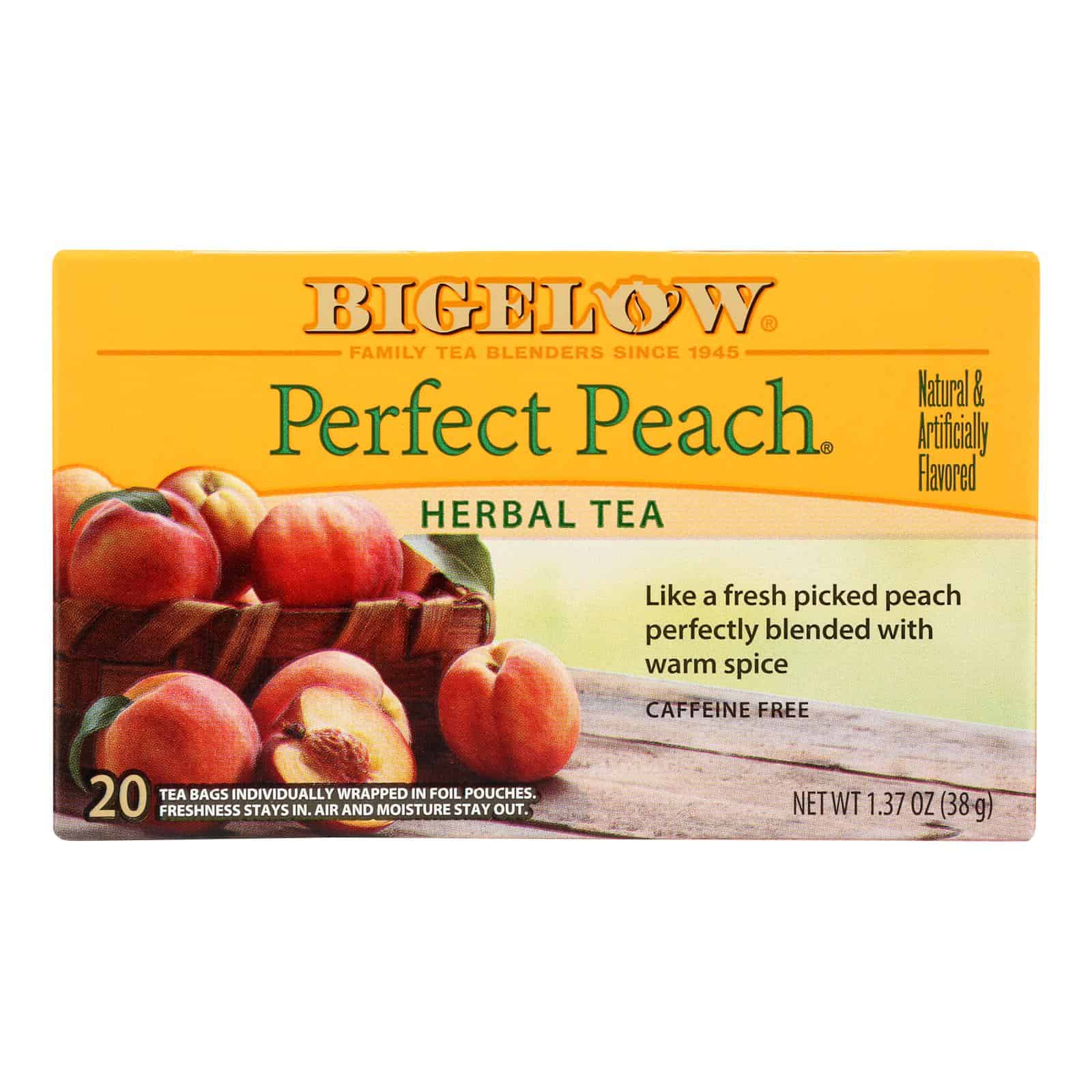 BIGELOW PERFECT PEACH HERBAL TEA DELIVERS THE FLAVORS OF FRESH PEACH PIE WRAPPED UP IN A WARM, SOOTHING CUP OF TEA. CAFFEINE-FREE FOR ENJOYMENT ANY TIME OF DAY, THIS TEA COMES READY TO BREW IN INDIVIDUALLY WRAPPED TEA BAGS. FOIL POUCHES KEEP AIR, MOISTURE AND OTHER AROMAS AWAY FROM THE TEA TO ENSURE FRESHNESS AND FULL FLAVOR, AND THE BOX, BAGS, STRINGS AND TAGS IN THIS 20 COUNT PACKAGE ARE ALL BIODEGRADABLE FOR EASY, GREEN DISPOSAL AFTER YOU ENJOY YOUR CUP.