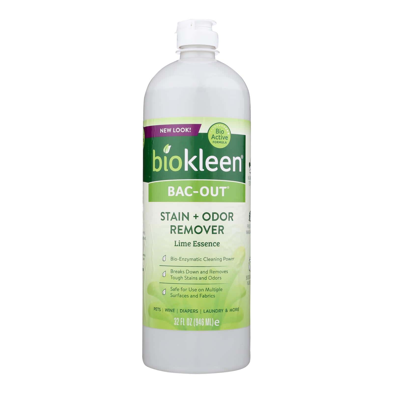 BIOKLEEN HOUSEHOLD CLEANERS, BAC-OUT STAIN & ODOR REMOVER HAS A UNIQUE BLEND OF LIVE ENZYME CULTURES AND LIME EXTRACT THAT ELIMINATES THE TOUGHEST STAINS AND ODORS AND THEN ELIMINATES THEIR RETURN. EACH 32 FL. OZ. BOTTLE IS FULL STRENGTH. TRY BAC-OUT ON PET ACCIDENTS, CARPET, WINE, DIAPERS AND PAILS, LAUNDRY, DISPOSALS, GARBAGE CANS AND MORE. BIOKLEEN HAS A GUIDING COMMITMENT TO PEOPLE, PETS AND OUR PLANET: HARNESSING THE POWER OF NATURE TO PRODUCE PLANT AND MINERAL BASED CLEANERS THAT WORK. WE ARE A FAMILY OWNED, PROUD U.S. MANUFACTURER THAT DOESN?T TEST ON ANIMALS. WE ALSO PARTICIPATE 100% IN ENERGY AND WATER OFFSETS. SEE THE LABEL FOR ALLERGENS AND WARNINGS.