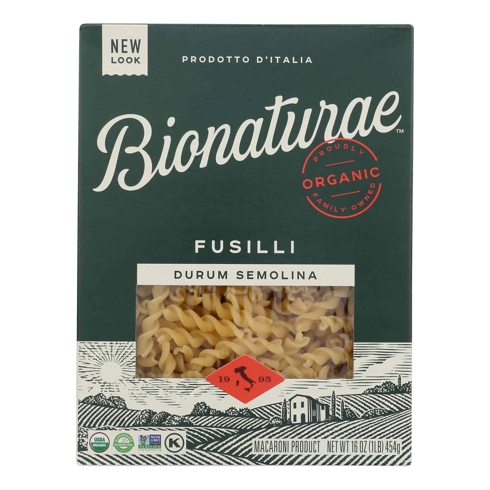 BIONATURAE SEMOLINA FUSILLI, 100% DURUM SEMOLINA IS MADE BY THE THIRD GENERATION OF A FAMILY OF PASTA MAKERS, WHO MASTERED THE ART OF MAKING ARTISAN PASTA OVER A CENTURY AGO. THIS ORGANIC AND KOSHER FRIENDLY PASTA IS MADE FROM ORGANIC DURUM WHEAT THAT HAS BEEN FRESHLY MILLED FOR EACH PRODUCTION. YOU CAN REALLY SEE AND TASTE THE DIFFERENCE. EACH BAG OF BIONATURAE SEMOLINA FUSILLI, 100% DURUM SEMOLINA CONTAINS 16 OZ. OF PRODUCT. SEE NUTRITION FACTS PANEL FOR ALLERGENS.