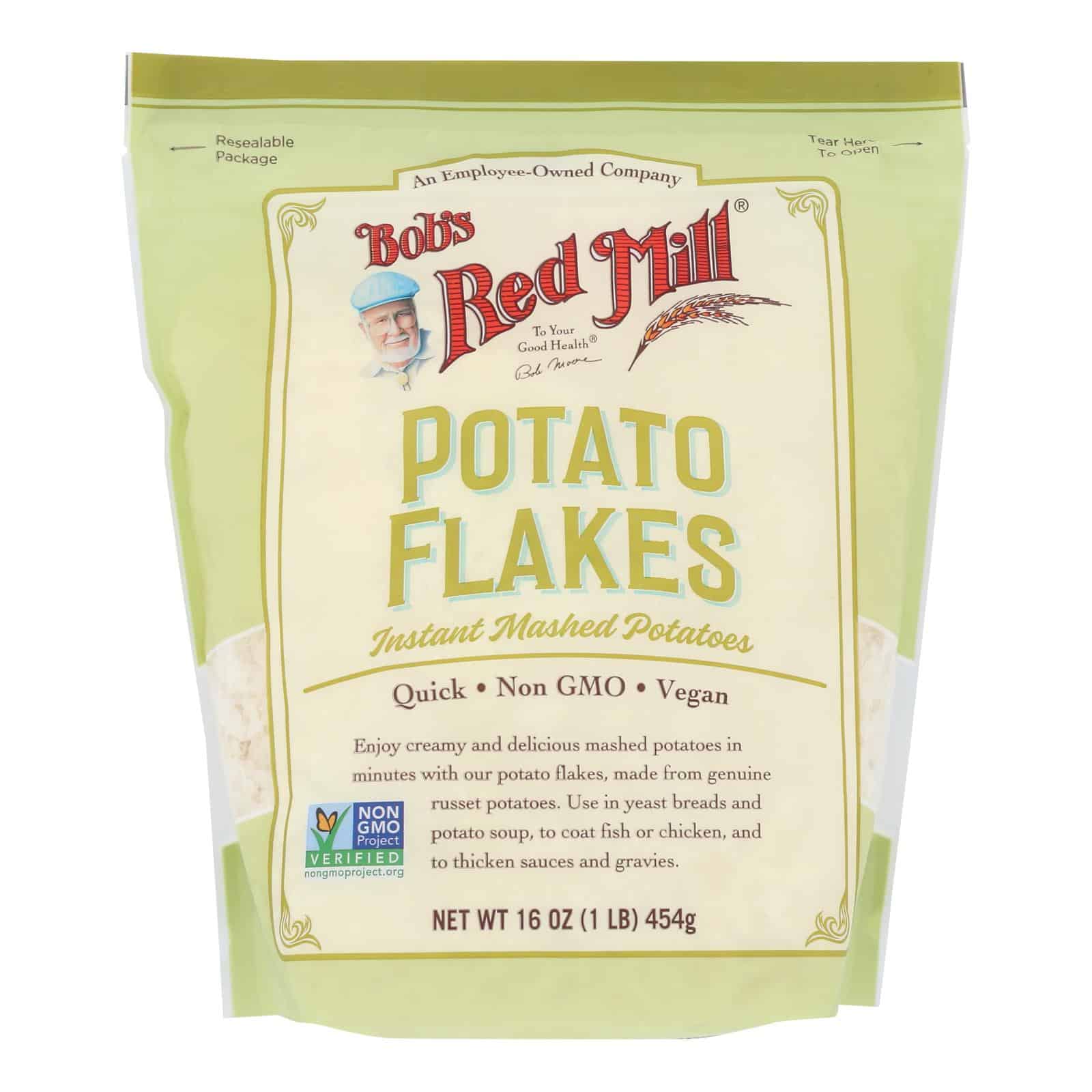 Instant mashed potatoes. Vegan. Non GMO. Non GMO Project verified. nongmoproject.org. An employee-owned company. To your good health – Bob Moore. Quick. Enjoy creamy and delicious mashed potatoes in minutes with our potato flakes, made from genuine russet potatoes. Use in yeast breads and potato soup, to coat fish or chicken, and to thicken sauces and gravies. Dear Friends, I’ve always believed that food is more than just sustenance, more than the sum of its nutrients. It’s also shared experiences. It’s memories. It’s love. For the past 40 years, I’ve made it my mission to bring a wide variety of wholesome, delicious foods to our customers, and I’m proud – and humbled – that so many people have put their trust in us. Thank you for bringing Bob’s Red Mill into your home. To your good health, Bob Moore. bobsredmill.com. For more information and recipes, visit bobsredmill.com. Resealable package.