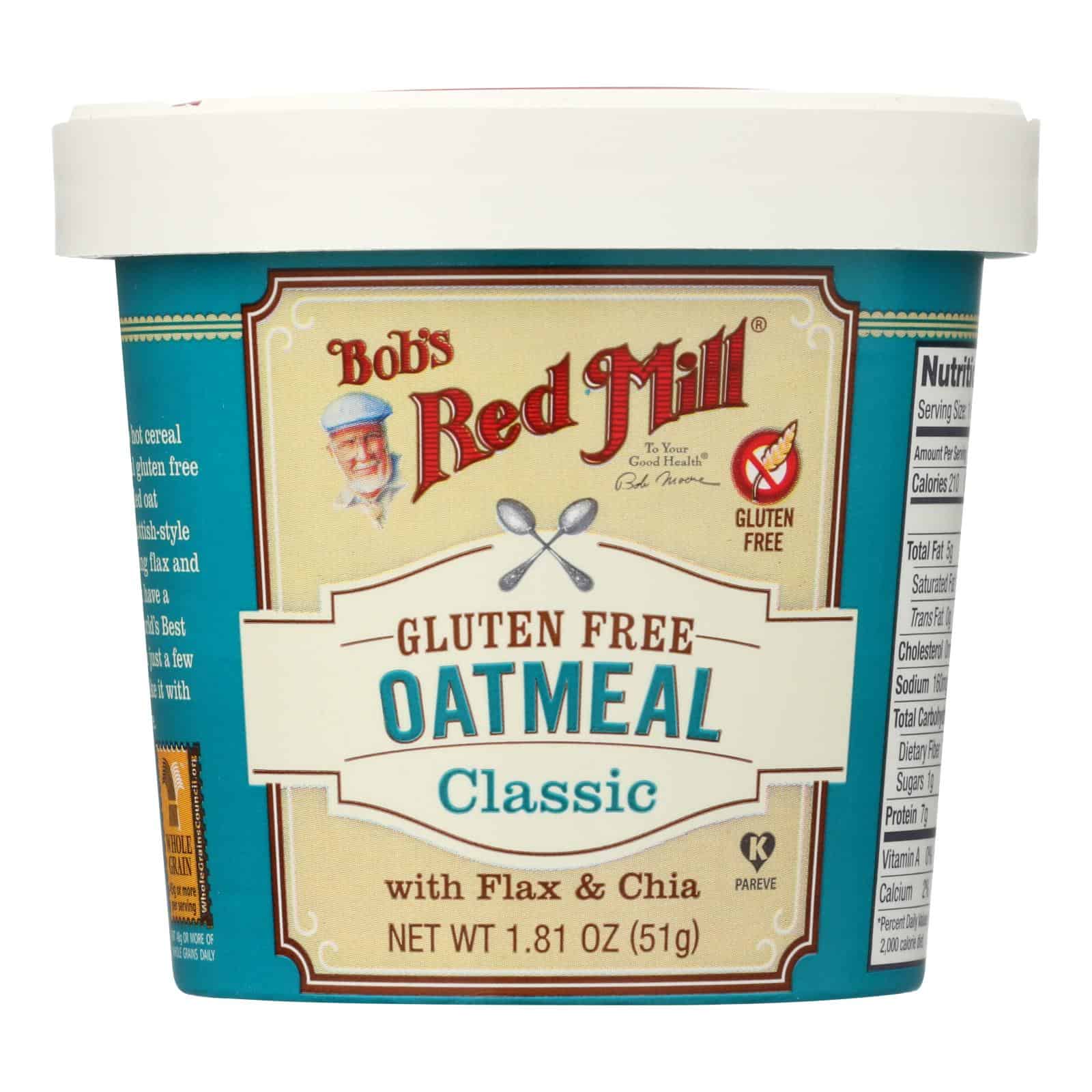 BOB?S RED MILL, OATMEAL CUPS, GLUTEN-FREE CLASSIC OATMEAL IS A GREAT IDEA FOR YOUR NEXT BREAKFAST. THIS PRODUCT IS MADE FROM A DELIGHTFUL GLUTEN-FREE BLEND OF WHOLE GRAIN ROLLED OAT GROATS, STONE GROUND SCOTTISH-STYLE OAT GROATS, AND NOURISHING FLAX AND CHIA SEEDS. BOB?S RED MILL, OATMEAL CUPS, GLUTEN-FREE CLASSIC OATMEAL IS READY TO EAT IN JUST A FEW MINUTES AND YOU CAN TAKE IT WITH YOU JUST ABOUT ANYWHERE BOB?S RED MILL, OATMEAL CUPS, GLUTEN-FREE CLASSIC OATMEAL IS MANUFACTURED IN A FACTORY THAT ALSO PROCESSES SOYBEANS, MILK, AND TREE NUTS. PLEASE SEE NUTRITIONAL FACTS PANEL FOR INFORMATION ON POSSIBLE ALLERGENS.