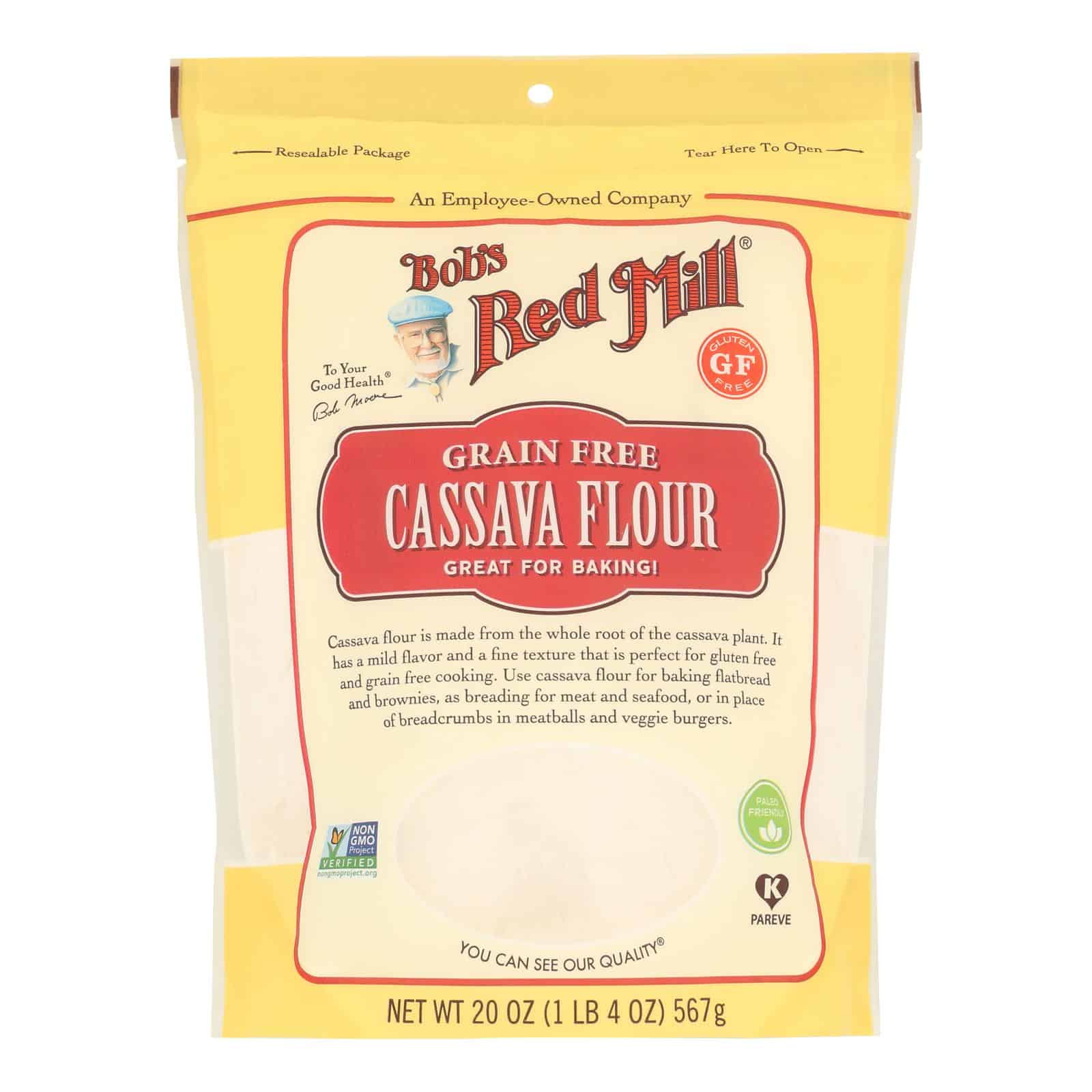 Gluten free. Tested and confirmed gluten free in our quality control laboratory. Vegan. Paleo friendly. Non GMO Project verified. nongmoproject.org. An employee-owned company. Great for baking! Cassava flour is made from the whole root of the cassava plant. It has a mild flavor and a fine texture that is perfect for gluten free and grain free cooking. Use cassava flour for baking flatbread and brownies, as breading for meat and seafood, or in place or breadcrumbs in meatballs and veggie burgers. You can see our quality. Dear Friends, Here at Bob’s Red Mill, we’ve explored far and wide to bring our customers a variety of alternative flours that are suited to every diet and taste. Our Cassava Flour is an excellent addition to your pantry. Its mild flavor and fine texture means you can use it in many different types of recipes. It’s all part of our commitment to bringing the world’s finest and most delicious ingredients to your table. To your good health, – Bob Moore. Reasons to love Cassava Flour: single ingredient; plant based. bobsredmill.com. Find more delicious recipes at bobsredmill.com. For information and recipes, visit bobsredmill.com. Resealable package.