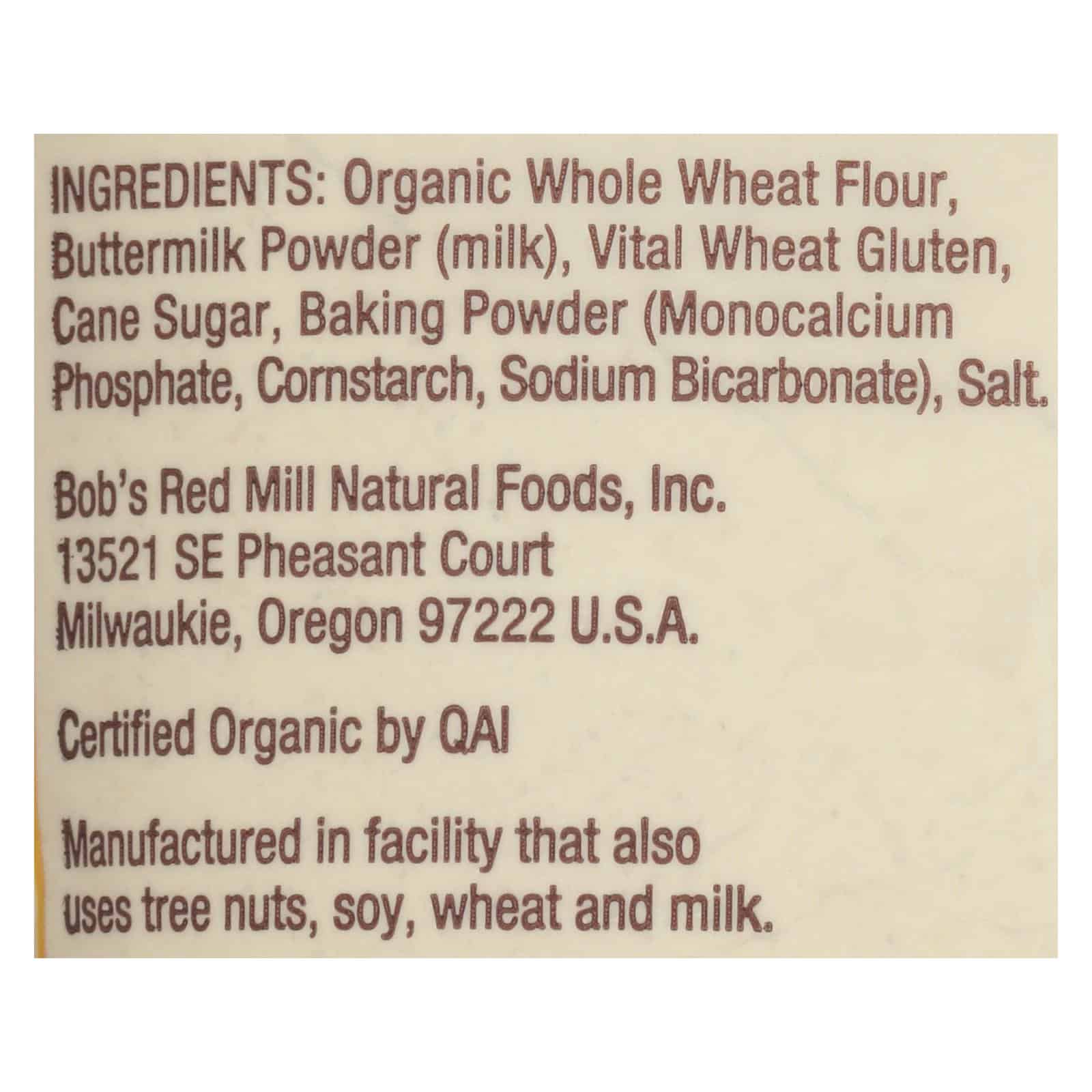 50% Whole Grain: 31 g or more per serving. 50% or more of the grains is whole grain. WholeGrainCouncil.org. Certified Organic by QAI. Made with organic flour. An Employee-Owned company. To your good health. – Bob Moore. Dear friends, my mission is to bring you whole grain foods for every meal of the day, and that starts with breakfast! With my buttermilk pancake & waffle mix, it’s easy to make a wholesome hot breakfast. Made with stone ground whole grain wheat flour, buttermilk and cane sugar, these are pancakes you’ll feel good about eating. To your good health, Bob Moore. bobsredmill.com. Find more recipes at bobsredmill.com. For more information and recipes, visit bobredmill.com. Resealable package.