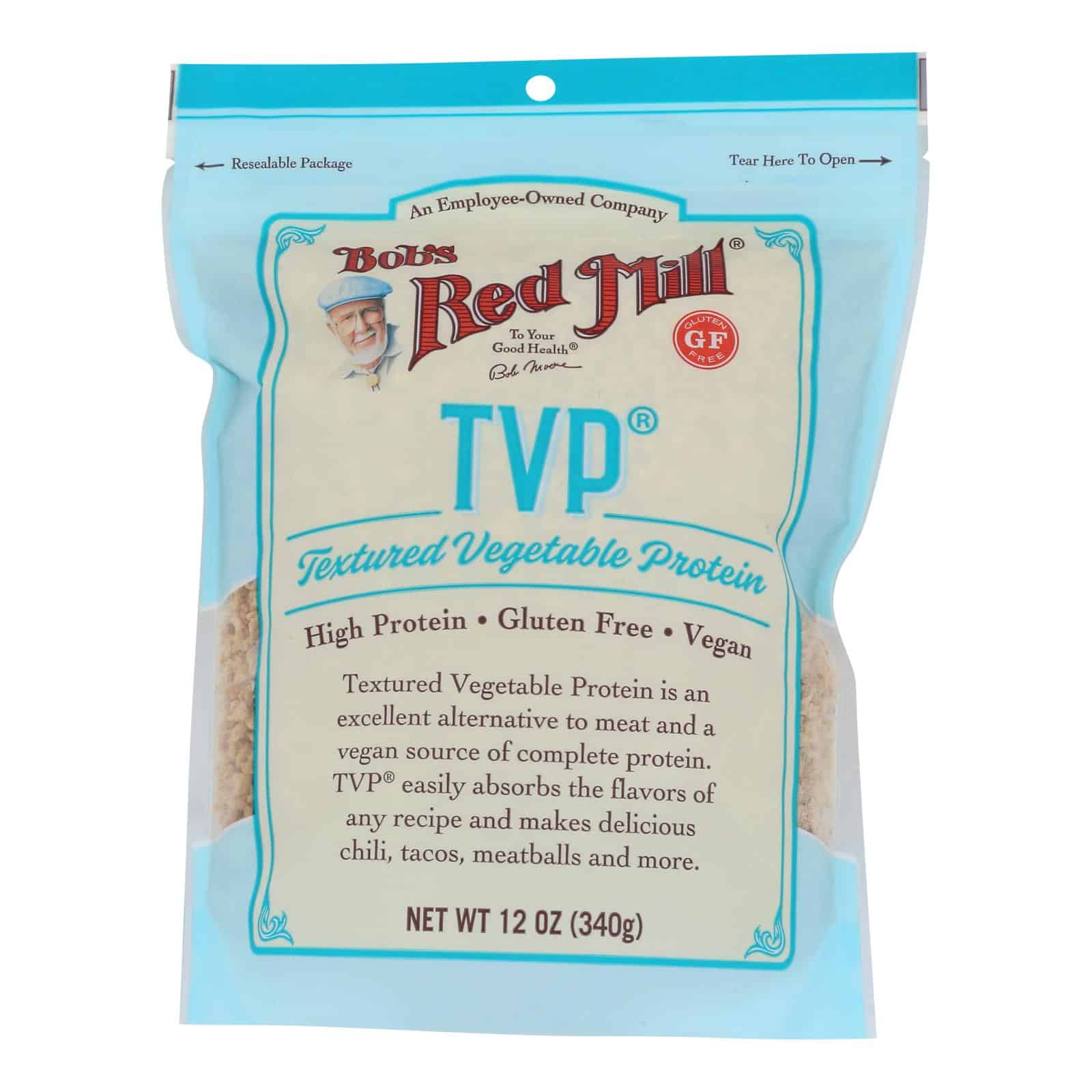 Vegan. Gluten free. Tested and confirmed Gluten Free in our quality control laboratory. High protein. An employee-owned company. To your good health, – Bob Moore. Textured Vegetable Protein is an excellent alternative to meat and a vegan source of complete protein. TVP easily absorbs the flavors of any recipe and makes delicious chili, tacos, meatballs and more. Dear friends, Since starting this company over 40 years ago, our mission has been to provide a diverse array of delicious food for all. We’re proud to offer a multitude of vegetarian and vegan foods that are rich in protein and a nutritious addition to a well-balanced diet. I hope this TVP inspires you to pursue new culinary adventures and explore our other fine products, including whole grains, beans and protein powders. To your good health, – Bob Moore. bobsredmill.com. For more information and recipes, visit bobsredmill.com. Resealable package.