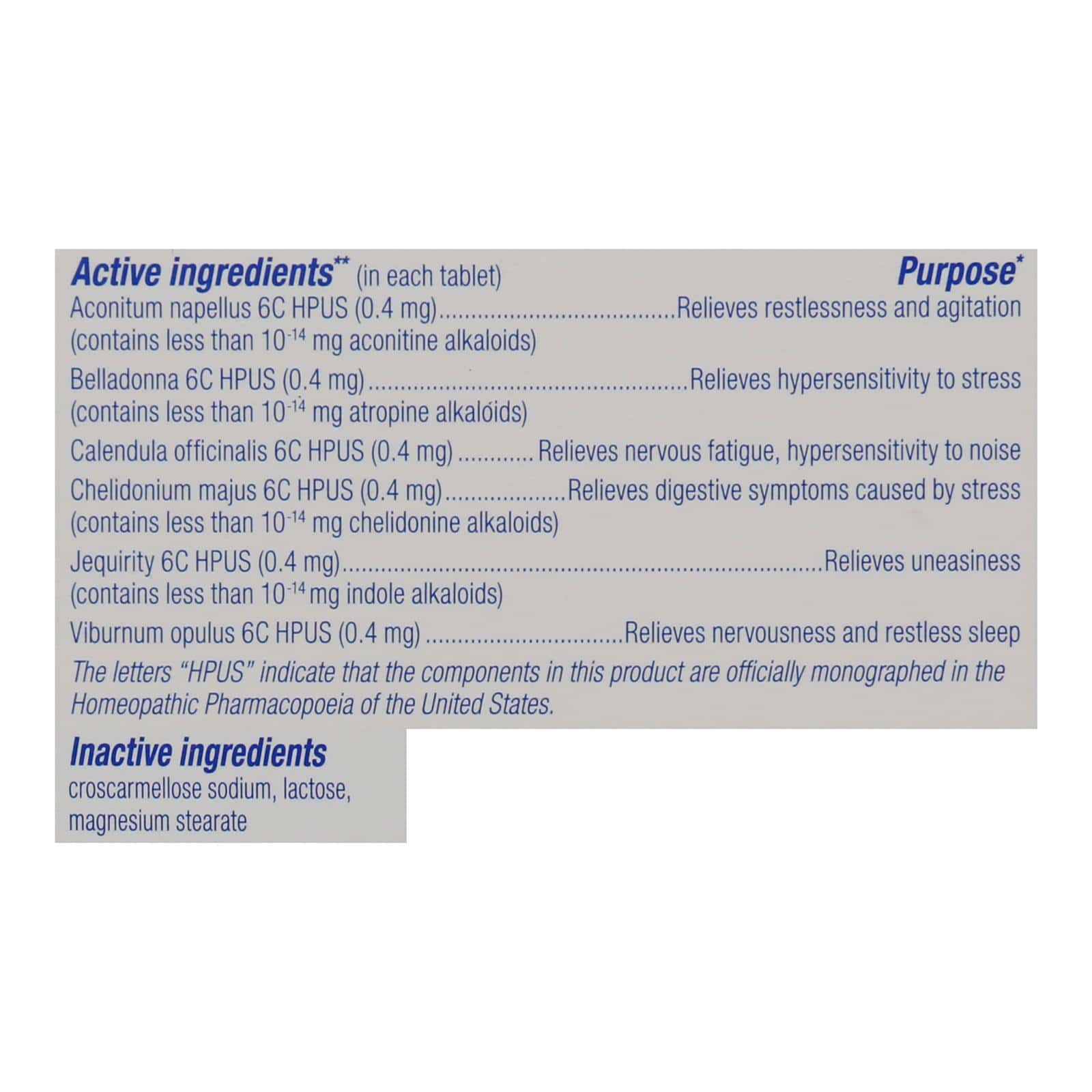 In Each Tablet Other Information: Do not use if glued carton end flaps are open or if the blister seal is broken. Store below 86 degrees F (30 degrees C). No artificial colors, flavors or sweeteners. Stress relief (claims based on traditional homeopathic practice, not accepted medical evidence. Not FDA evaluated) Reduces nervous tension calms mind & body (claims based on traditional homeopathic practice, not accepted medical evidence. Not FDA evaluated). Homeopathic Medicine: Stay focused & relaxed; Plant-based actives; Non-drowsy. World leader in homeopathic medicines. Meltaway tablets require no food or water. Non-habit forming. No known drug interactions. BoironUSA.com. Questions or comments? BoironUSA.com. Info(at)Boiron.com. 1-800-Boiron-1 (1-800-264-7661). The Boiron Promise: Your health deserves the greatest respect. That’s why we’re committed to your satisfaction. Please visit BoironUSA.com/promise for details. Please recycle. Made in France. Other information: Do not use if glued carton end flaps are open or if the blister seal is broken. Store below 86 degrees F (30 degrees C).