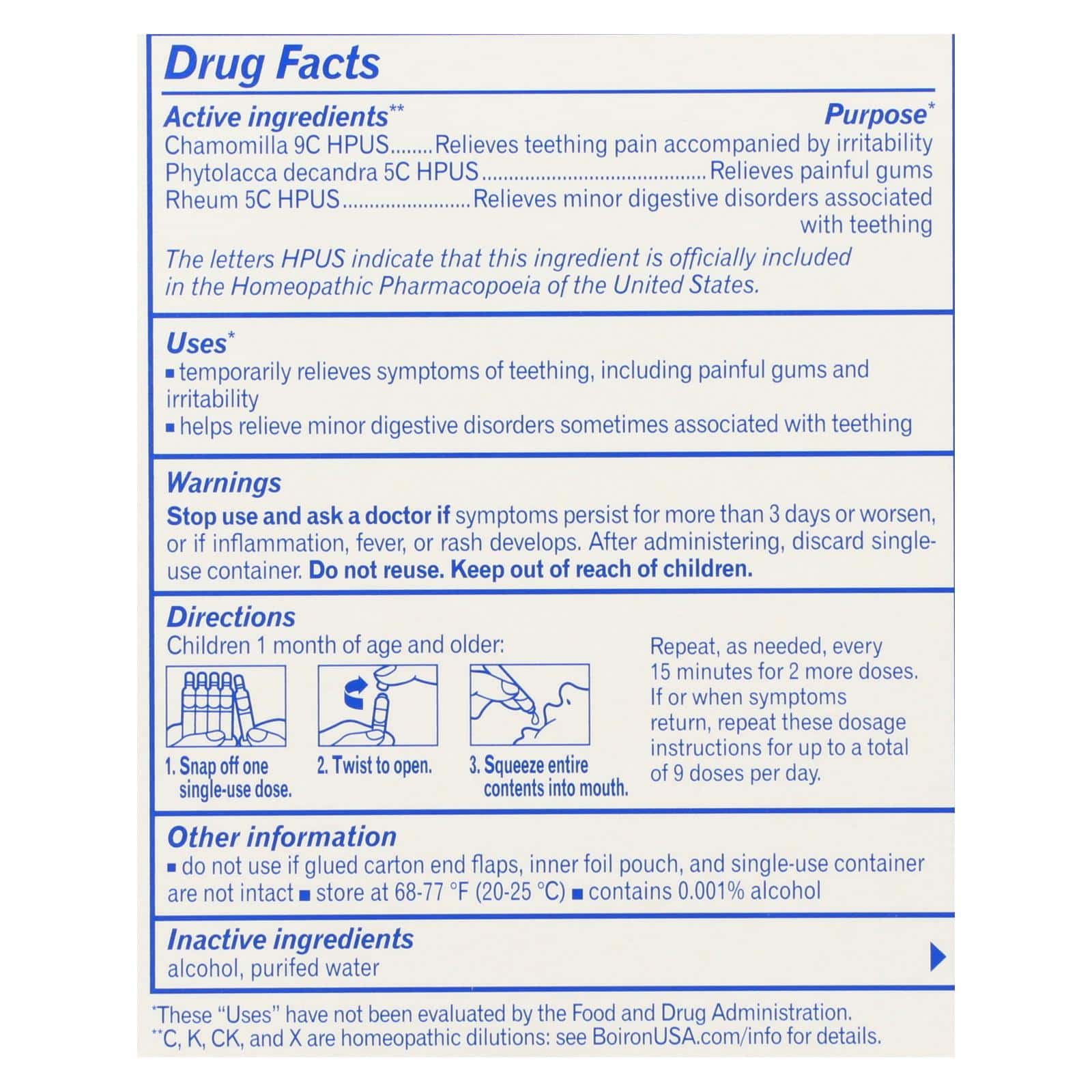 Other Information: Do not use if glued carton end flaps, inner foil pouch, and single-use container are not intact. Store at 68-77 degrees F (20-25 degrees C). Contains 0.001% alcohol. Babies 1 month & up. Painful gums irritability. Natural active ingredients. Homeopathic medicine. Benzocaine & preservative-free. Single oral liquid doses. 99.999% alcohol-free. Sterile single-use liquid oral doses. No risk of overmedicating. No numbing of gag reflex. The Boiron Promise. At Boiron, we believe there’s more than one way to feel better. Since 1932, the Boiron family has been committed to providing quality medicines. As world leader in homeopathy, our passion is your health. Our promise is your satisfaction. BoironUSA.com/promise for details. World leader in homeopathic medicines. BoironUSA.com. Questions or comments? CamiliaTeething.com; BoironUSA.com; info(at)Boiron.com; 1-800-BOIRON1 (1-800-264-7661). Please recycle. (These Uses have not been evaluated by the Food and Drug Administration). Made in France. Other information: Do not use if glued carton end flaps, inner foil pouch, and single-use container are not intact. Store at 68-77 degrees F (20-25 degrees C). Contains 0.001% alcohol.