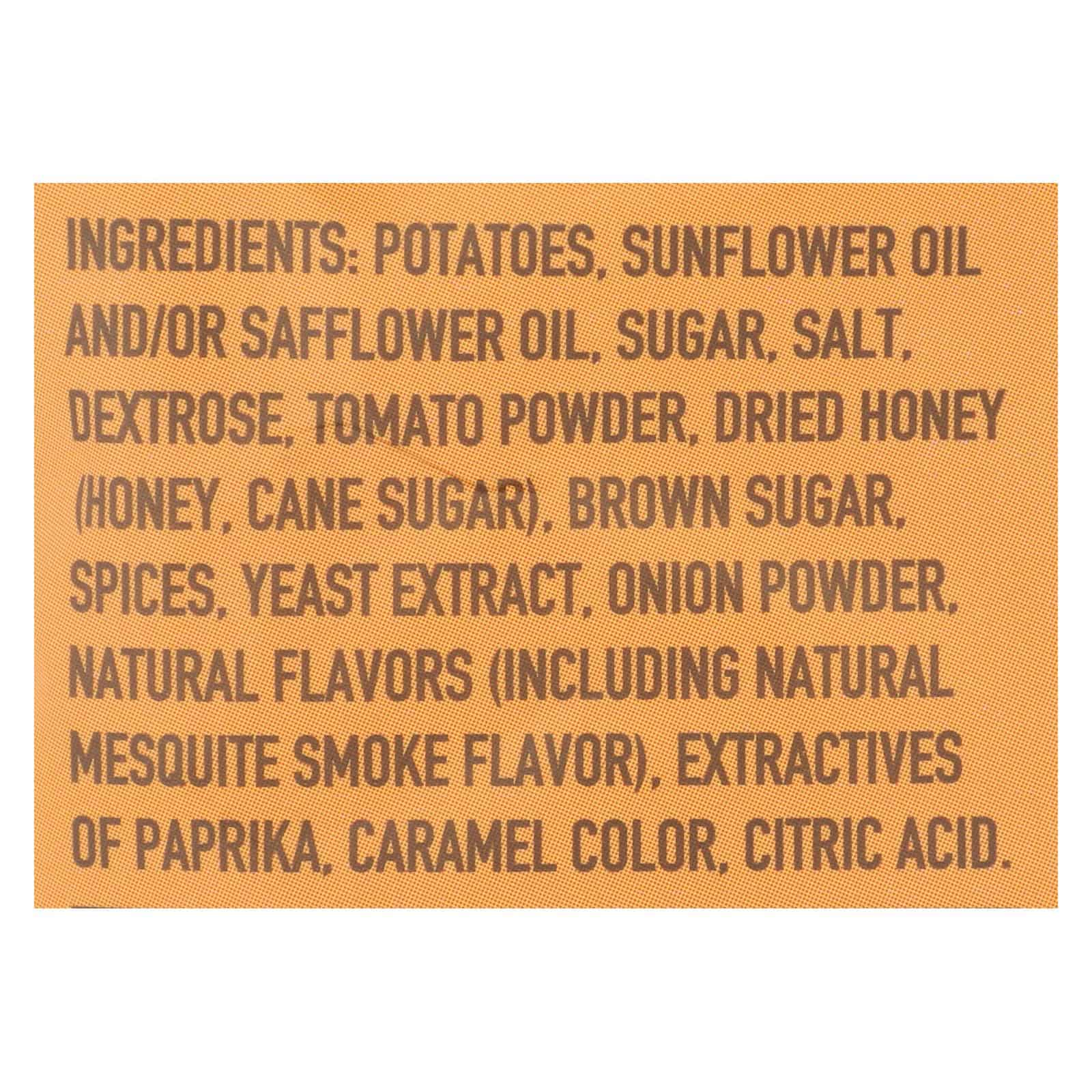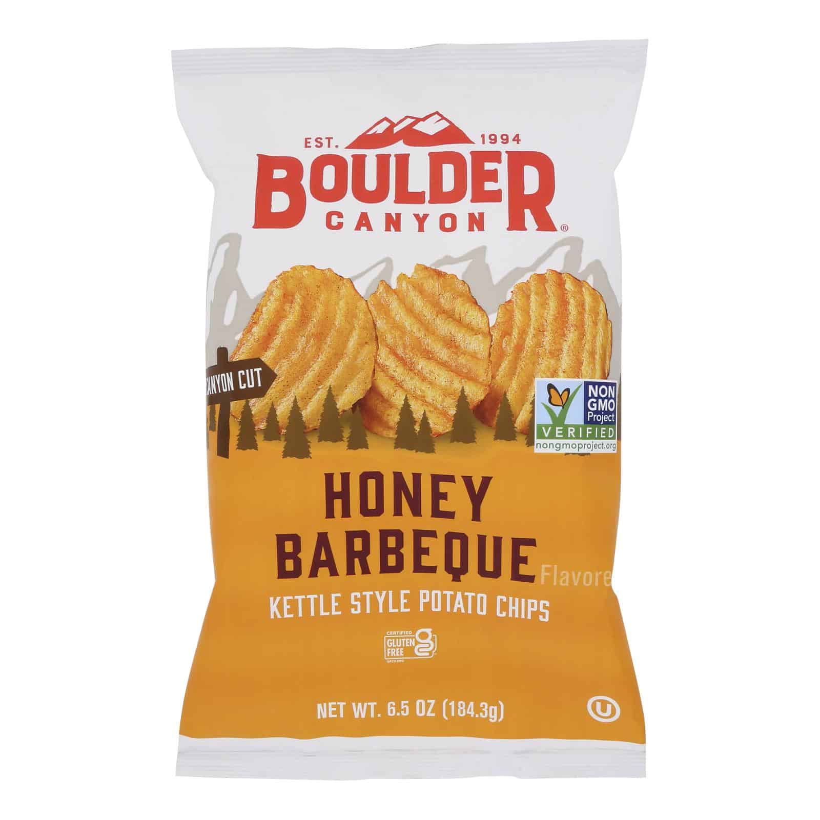 BOULDER CANYON HONEY BAR-B-QUE CANYON CUT KETTLE CHIPS ARE RICHLY FLAVORED AND WILL SATISFY YOUR SNACK CRAVING EVERY TIME YOU HAVE ONE. INSPIRED BY THE CARVED CANYONS OUTSIDE OUR HOMETOWN AND OUR LOVE FOR GREAT BBQ, THESE WAVY CANYON CUT CHIPS HAVE A SMOKY BARBEQUE FLAVOR WITH A TOUCH OF SWEET HONEY. THESE ARE PERFECT FOR WHEN YOU SIMPLY WANT A COMFORTING FLAVOR WITH A BOLD BITE. MADE FROM PREMIUM AMERICAN-GROWN POTATOES FROM AN ORIGINAL FAMILY RECIPE, THEY’RE KETTLE COOKED IN SMALL BATCHES AND SEASONED TO PERFECTION. WITH SIMPLE INGREDIENTS AND ONLY 140 CALORIES PER SERVING, YOU CAN NOW SNACK WITHOUT EVEN A HINT OF GUILT ON YOUR CONSCIENCE. OUR BOULDER BENEFITS INCLUDE CERTIFIED GLUTEN FREE, NON-GMO, NO TRANS FATS, NO CHOLESTEROL, KOSHER, AND GREEN ENERGY USE. INCLUDES 6.5 OZ. PACKAGE. BOULDER CANYON AUTHENTIC FOODS IS PROUD TO BE AMONG THE NATURAL FOOD INNOVATORS OUT TO PROVE THAT A BETTER EXPERIENCE EXISTS WHEN USING REAL FOOD INGREDIENTS. LIVE BETTER. EAT BOULDER.
