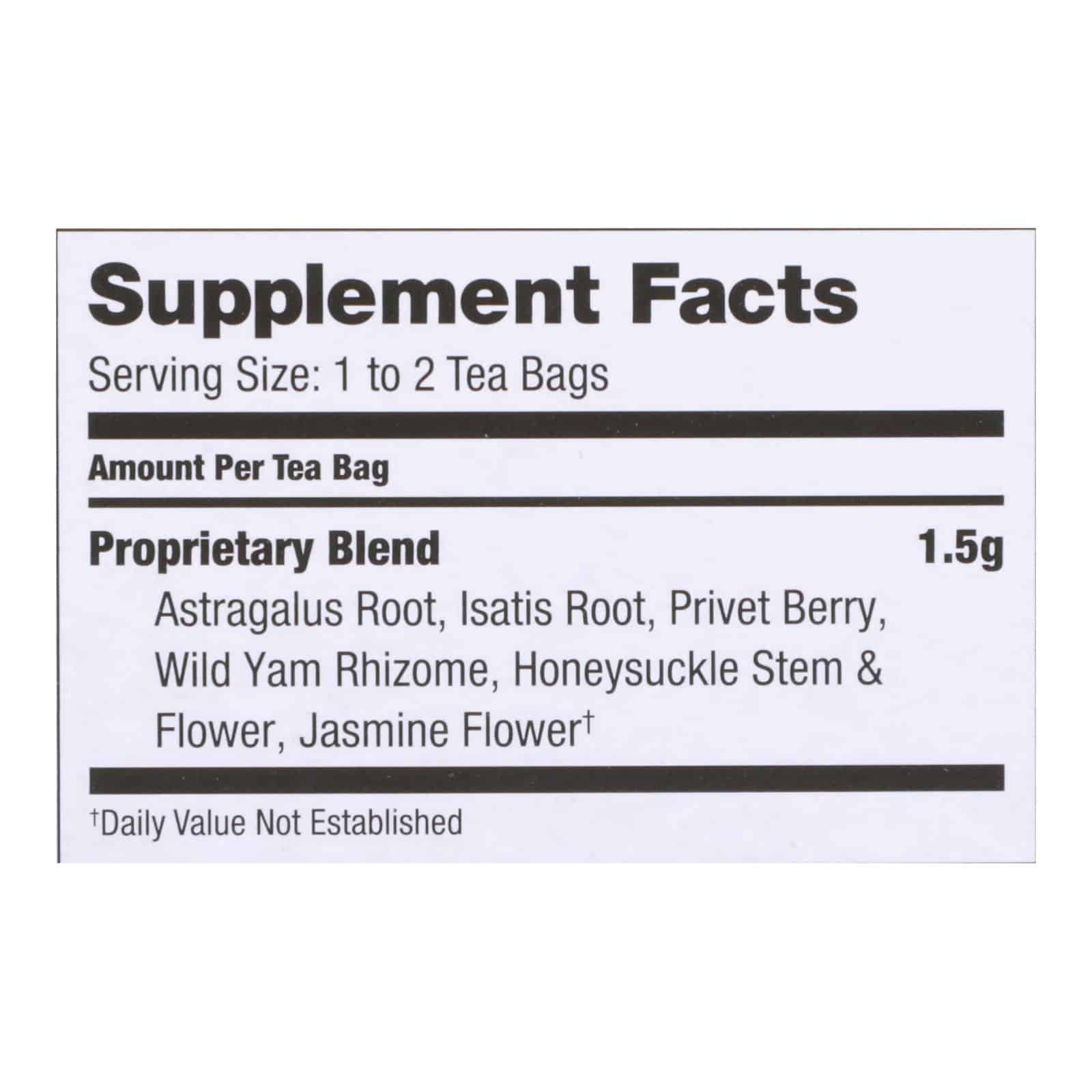 Herbal Supplement. Promotes healthy immune functions. 100% natural. Naturally caffeine free. Non GMO Project verified. nongmoproject.org. Gluten free. Non-GMO Project verified. No artificial flavoring. No preservatives. The Way of Traditional Chinese Herbalism: The right combination and quality of each herb working together harmoniously makes all the difference. Astragalus and isatis are the most popular herbs used in traditional Chinese medicine during the cold and flu season. This time honored formula combines several precious herbs into an effective and soothing blend to support overall healthy immune functions. Vegan. Skillfully blended for superior results! Time Tested Benefits: Bravo Teas are based on the wisdom of traditional Chinese herbal medicine, a natural holistic system that has been practiced for over 4000 years, cultivating health and wellness. Bravo Tea Guarantee: Only premium, top quality herbs go into our teas. We use wild grown, hand crafted herbs whenever possible to ensure that you get the best mother nature can offer. Jasmine Infused Flavor: The natural flavors of the precious herbs in each of our teas are delicately woven with the smooth and refreshing taste of jasmine flowers to create deliciously balanced brew every time you enjoy a cup of Bravo Tea. www.BravoTea.com. To reduce our environmental impact, Bravo Tea cartons are printed on 100% recycled cardboard with environmentally friendly inks. Please recycle this box. (These statements have not been evaluated by the Food and Drug Administration. This product is not intended to diagnose, treat, cure or prevent any disease.) Made in USA.