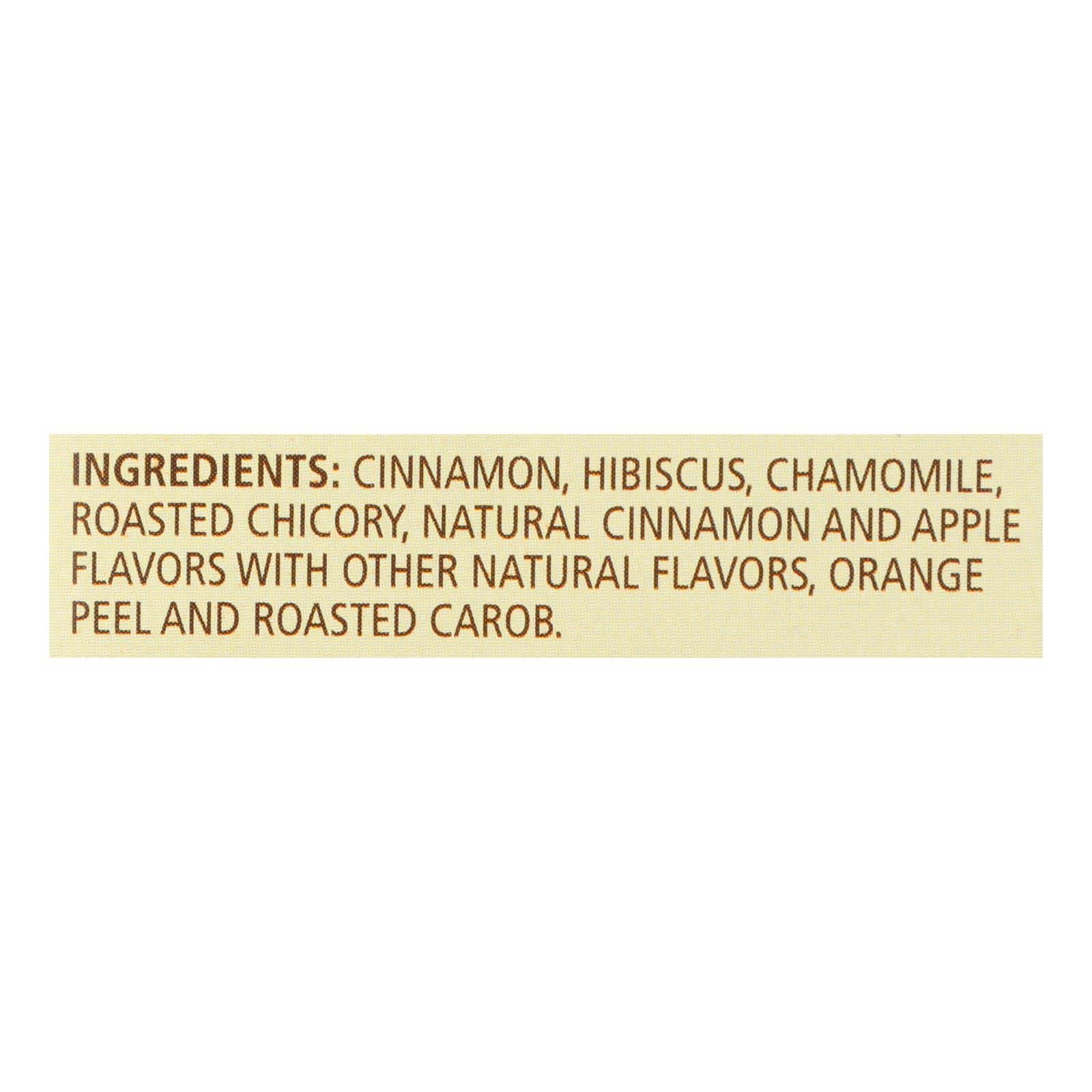 CELESTIAL SEASONINGS HERBAL TEA, CINNAMON APPLE SPICE IS A UNIQUELY FLAVORED, NATURALLY CAFFEINE FREE TEA. IT IS BLENDED WITH CINNAMON, HIBISCUS, CHAMOMILE, ROASTED CHICORY, AND OTHER FLAVORS. TOGETHER THESE CREATE A TASTE YOU WILL SAVOR. THIS LIVELY BLEND IS DOMINATED BY AN AROMATIC BURST OF SWEET AND SPICY CINNAMON AND THE FLAVOR OF RIPE, JUICY APPLES, WITH A NOTE OF CHOCOLATE AND BUTTERSCOTCH. GLUTEN-FREE AND KOSHER, THIS TEA DOES NOT CONTAIN ARTIFICIAL COLORS, FLAVORS OR PRESERVATIVES. EACH BOX CONTAINS 20 TEABAGS. SEE NUTRITION FACTS PANEL FOR ALLERGENS. YOU’LL LOVE THE AROMA AS MUCH AS THE FLAVOR IN THIS RICH, LUXURIOUS TEA.