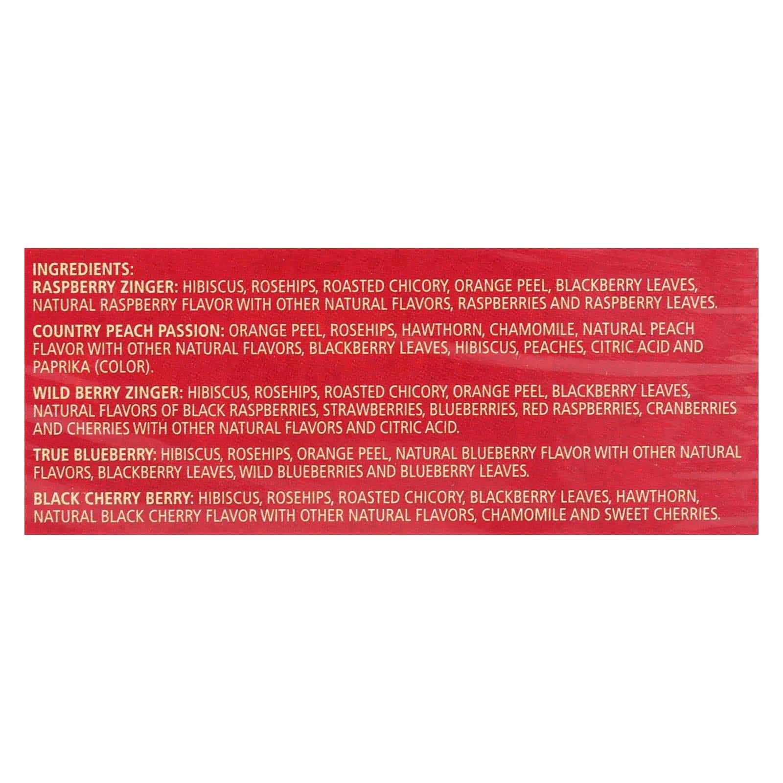 CELESTIAL SEASONINGS HERBAL TEA, FRUIT TEA SAMPLER IS A LIVELY FRUIT TEA COLLECTION, INCLUDING FIVE OF CELESTIAL SEASONINGS’ MOST BELOVED TEAS. FROM THE SWEET, SIMPLE FLAVOR OF BLACK CHERRY BERRY TO THE SOPHISTICATED TANG OF WILD BERRY ZINGER, EACH OF THESE HERBAL FRUIT TEA BLENDS IS SATISFYING WHEN HOT AND INVIGORATING OVER ICE. ALSO INCLUDES COUNTRY PEACH PASSION, TRUE BLUEBERRY, AND RED RASPBERRY ZINGER. EACH BOX CONTAINS 18 TEABAGS. SEE NUTRITION FACTS PANEL FOR ALLERGENS. YOU’LL LOVE THE AROMA AS MUCH AS THE FLAVOR IN THESE RICH, LUXURIOUS TEAS.
