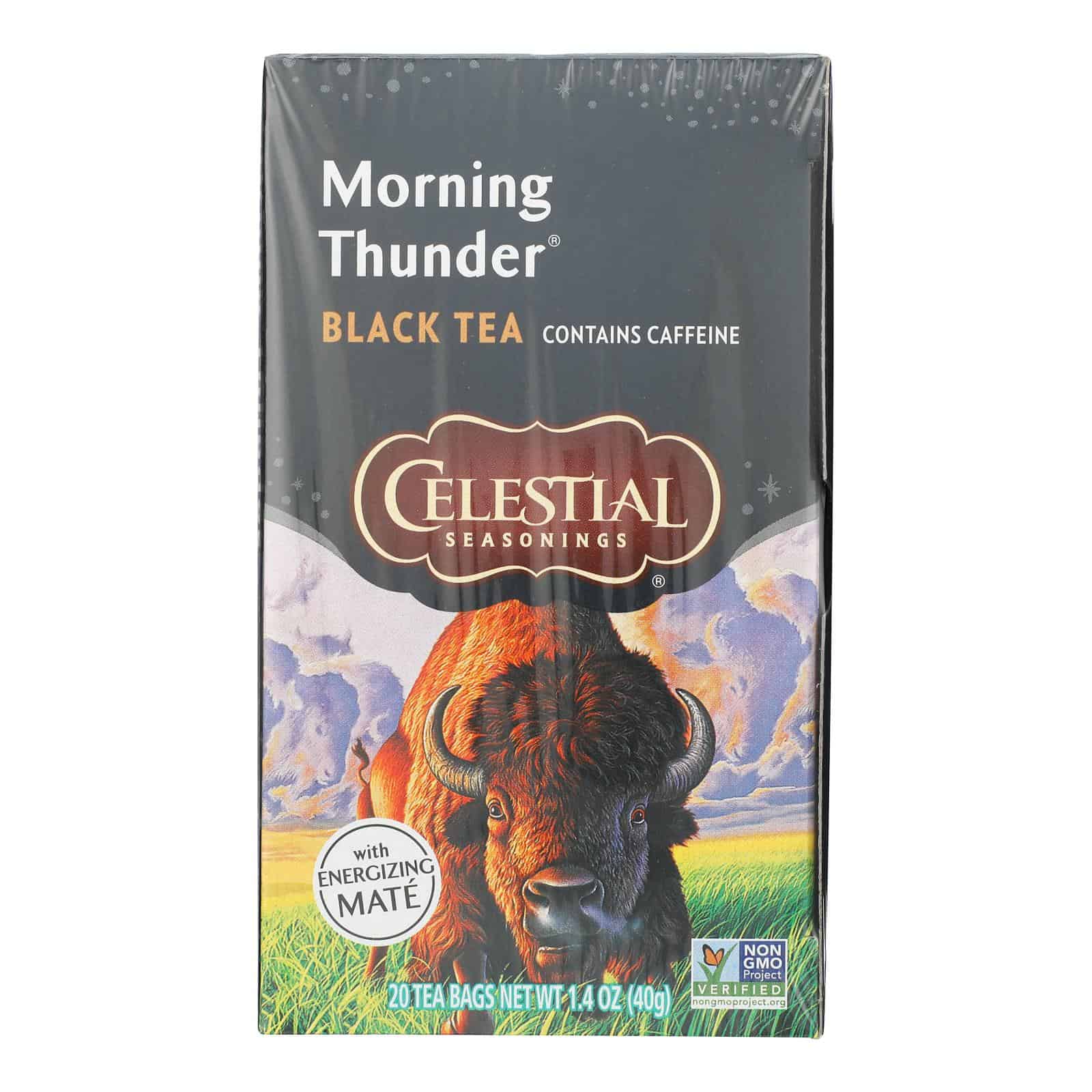 CELESTIAL SEASONINGS BLACK TEA, MORNING THUNDER IS EXACTLY WHAT YOU WOULD THINK, A CHARGING BLEND OF BLACK TEA AND ROASTED MATE. AROMATIC AND INVIGORATING, THIS IS A PERFECT TEA FOR WAKING UP, GETTING YOUR DAY STARTED, AND KEEPING YOUR MIND SHARP THROUGHOUT THE MORNING. IT IS NON-GMO, AND DOES NOT CONTAIN ARTIFICIAL COLORS, FLAVORS OR PRESERVATIVES. IT DOES HAVE A WALLOP OF CAFFEINE. EACH BOX CONTAINS 20 TEABAGS. SEE NUTRITION FACTS PANEL FOR ALLERGENS. THIS IS A RICH, INVIGORATING TEA THAT WILL GET YOUR MIND IN GEAR. YOU’LL LOVE THE AROMA AS MUCH AS THE FLAVOR.