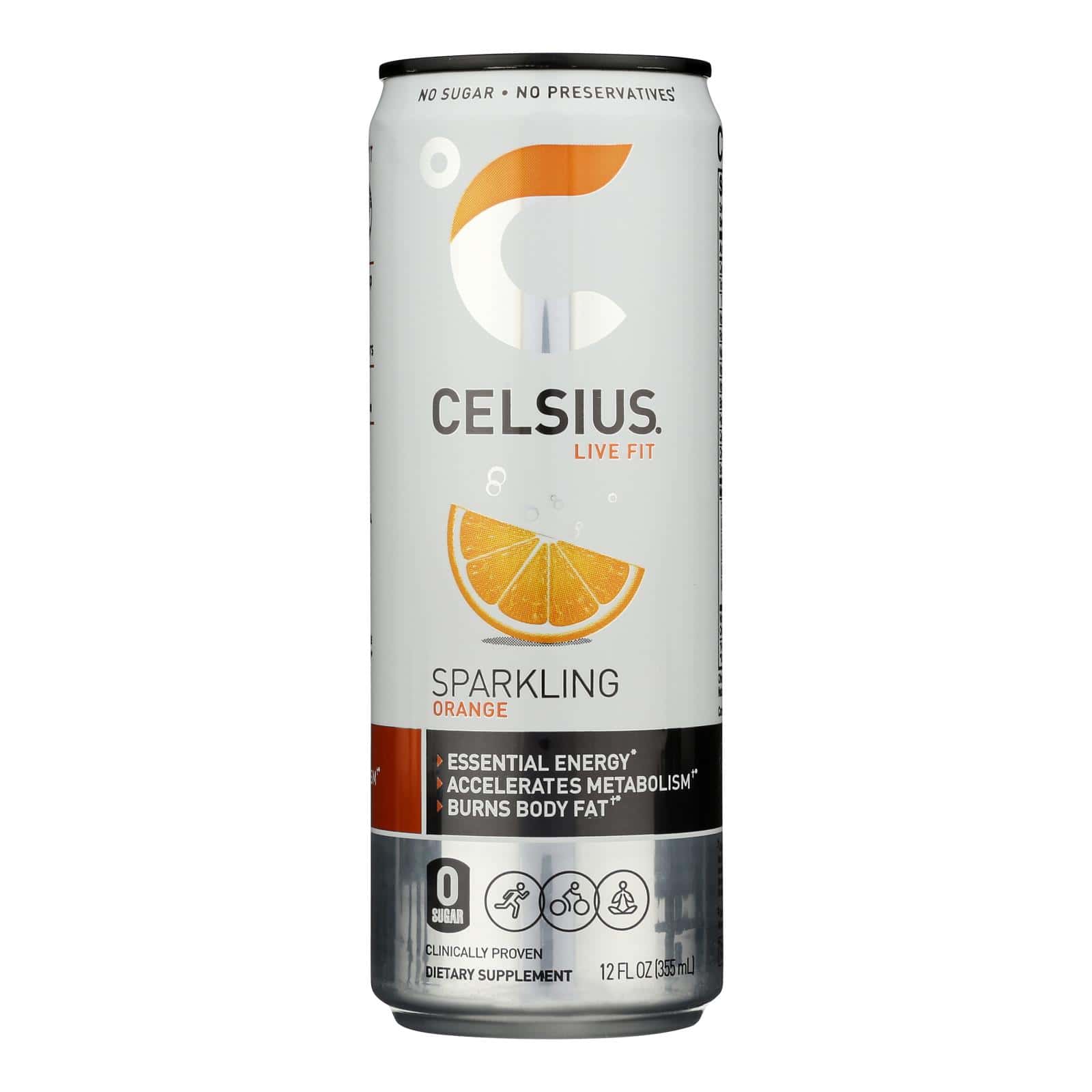 CELSIUS SPARKLING ORANGE DIETARY SUPPLEMENT IS SUGAR-FREE, VEGAN-FRIENDLY BEVERAGE SPECIALLY FORMULATED TO HELP ACCELERATE METABOLISM, BURN BODY FAT AND DELIVER ENERGY TO YOUR BUSY BODY. DESIGNED FOR CONSUMPTION BEFORE FITNESS ACTIVITIES, CELSIUS USES A BLEND OF GREEN TEA, GINGER AND GUARANA SEED TO TRIGGER THERMOGENESIS AND SPEED UP YOUR METABOLIC RATE. THIS CAN CONTAINS 12 FL. OZ. OF SPARKLING COLA DIETARY SUPPLEMENT AND INCLUDES 100% OF SEVEN ESSENTIAL VITAMINS.