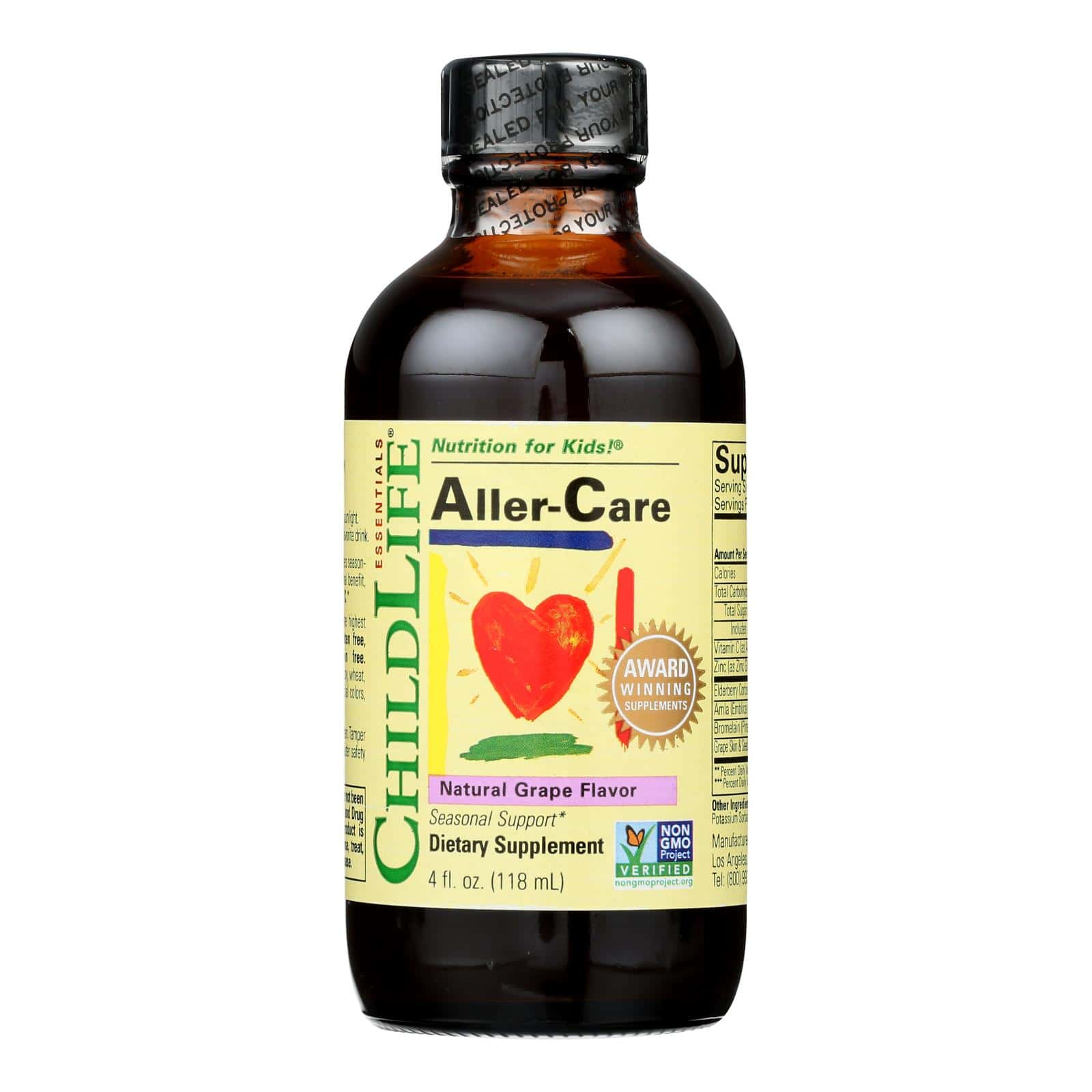 Dietary Supplement. Nutrition for kids! Great taste. Seasonal support. Health Tip: This formula provides seasonal support for children. For optimal benefit, use with vitamin C. ChildLife uses only the highest quality ingredients. Gluten free, casein free, alcohol free. Contains no milk, eggs, soy, wheat, yeast, or corn. No artificial colorings, flavorings or sweeteners. ChildLife Aller-Care is a unique formula to support your child’s immune response system. (These statements have not been evaluated by the Food and Drug Administration. These products are not intended to diagnose, treat, cure or prevent any disease.)