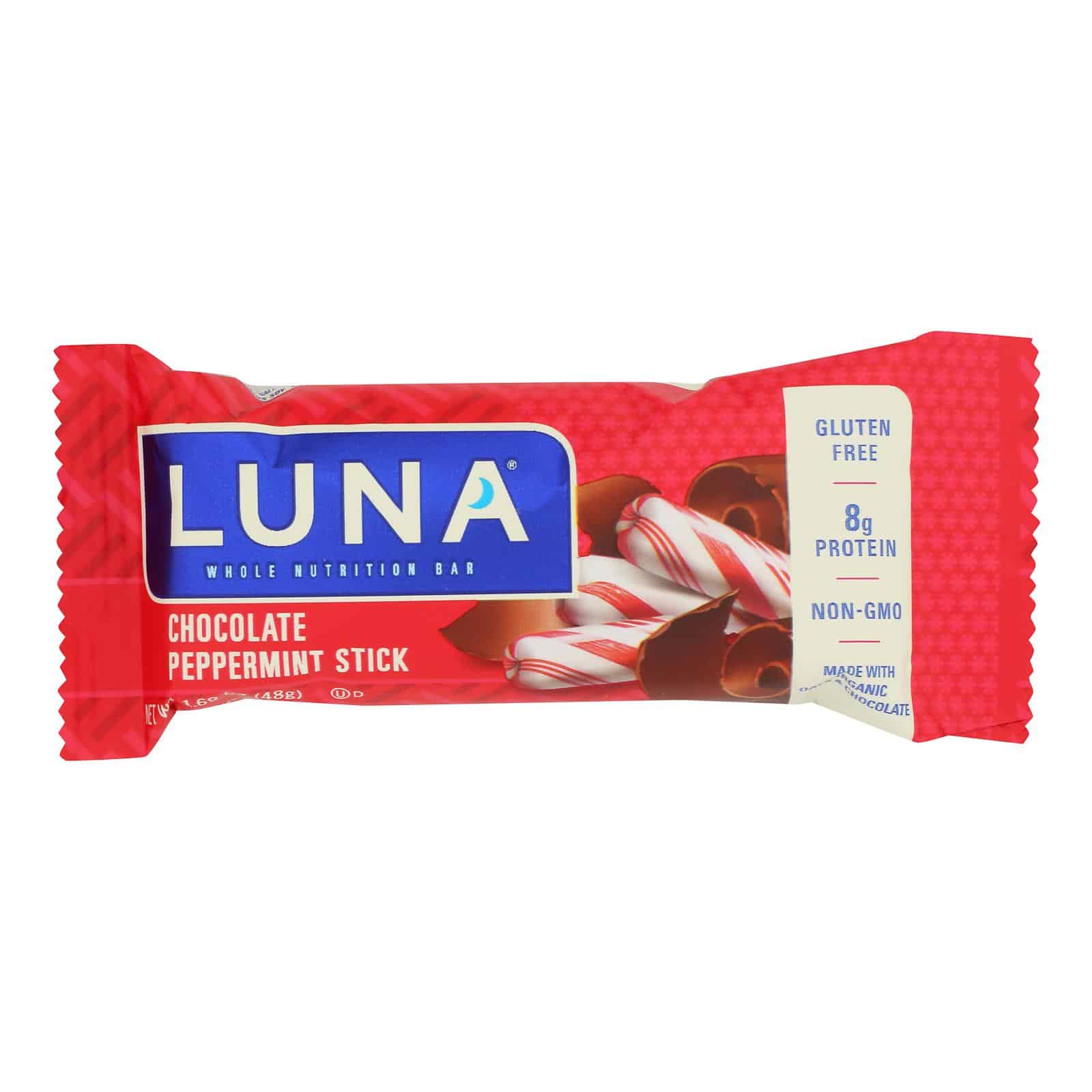 LUNA NUTRITION BARS, CHOCOLATE PEPPERMINT STICK ARE A DELICIOUS AND NUTRIENT RICH BAR PERFECT FOR ON-THE-GO SNACKING. WITH 3 GRAMS OF DIETARY FIBER AND 7 GRAMS OF PROTEIN PER SERVING, LUNA NUTRITION BARS, CHOCOLATE PEPPERMINT STICK ARE AN EXCELLENT WAY TO BOOST YOUR ENERGY AND OVERALL HEALTH THROUGHOUT THE DAY. EACH LUNA NUTRITION BAR, CHOCOLATE PEPPERMINT STICK WEIGHS 1.69 OZ. WITH 190 CALORIES PER SERVING. SEE NUTRITION FACTS PANEL FOR ALLERGENS.