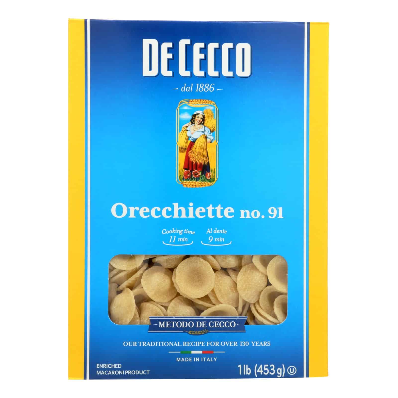 DECECCO ORECCHIETTE NO. 91 ENRICHED MACARONI PRODUCT IS MADE USING HIGH-QUALITY COARSE DURUM WHEAT SEMOLINA TO PRESERVE GLUTEN INTEGRITY, AND IT’S DRIED AT LOW TEMPERATURES TO RETAIN THE WHEAT’S FLAVOR. THIS ENRICHED MACARONI PRODUCT COOKS IN NINE TO 11 MINUTES, SO IT’S A CONVENIENT OPTION WHEN YOU NEED TO THROW TOGETHER A QUICK DINNER FOR YOUR FAMILY OR MAKE A SIDE DISH TO TAKE TO A PARTY. EACH 1 LB. BOX OF ORECCHIETTE CONTAINS APPROXIMATELY EIGHT 2/3 C. SERVINGS.