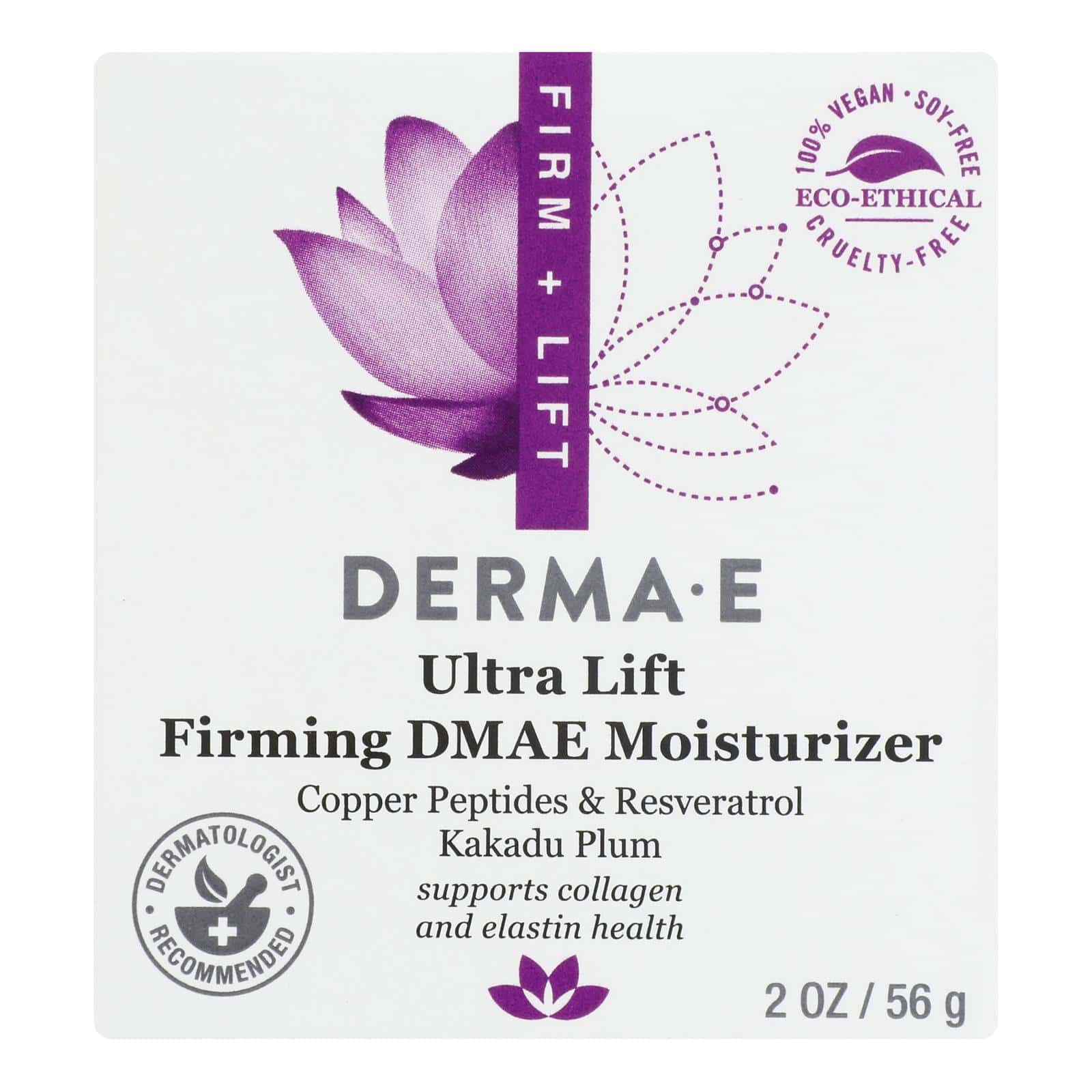 DERMA E, MOISTURIZER, FIRMING DMAE IS ECO-ETHICAL. THIS PRODUCT IS A NUTRIENT-RICH MOISTURIZER IS CLINICALLY PROVEN TO IMPROVE THE APPEARANCE OF SKIN FIRMNESS AND ELASTICITY. DERMA E, MOISTURIZER, FIRMING DMAE CONTAINS REPLENISHING DMAE WHICH HELPS SKIN TO APPEAR VISIBLY SMOOTHER AND LIFTED.THIS PRODUCT HAS ANTIOXIDANT-RICH ALPHA LIPOIC ACID AND VITAMIN C-ESTER TO NOURISH FOR A MORE REVITALIZED LOOK. DERMA E, MOISTURIZER, FIRMING DMAE IS 100% VEGAN, CRUELTY-FREE AND DOES NOT CONTAIN GLUTEN, SOY OR GMOS AND COMES IN A 2 OZ. BOX. SEE DRUG FACTS PANEL FOR WARNINGS.