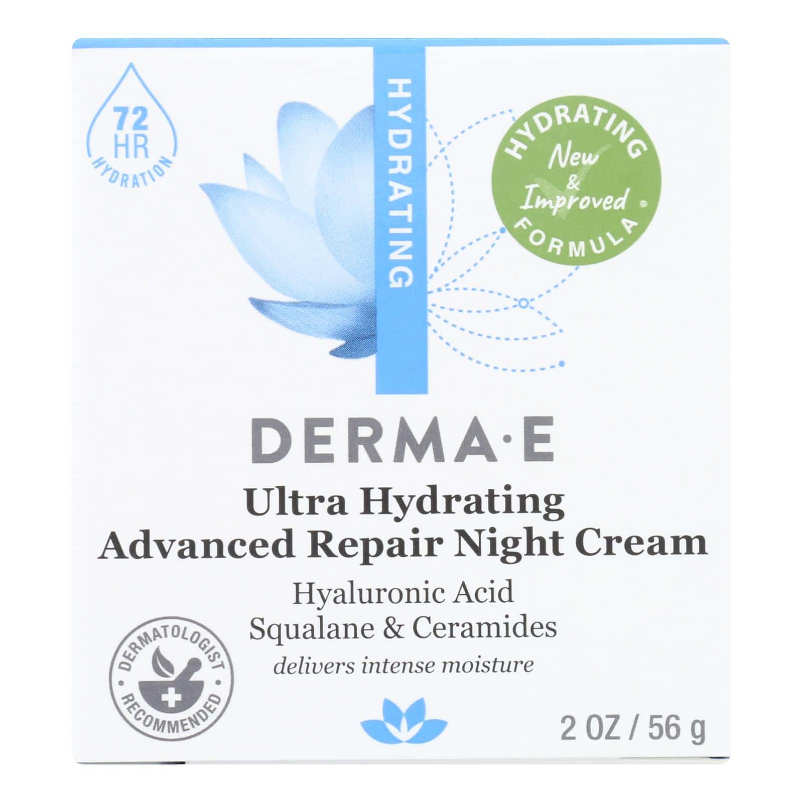 DERMA E, NIGHT CREME, HYDRATING, HYALURONIC ACID IS ECO-ETHICAL. THIS PRODUCT IS AN ULTRA-RICH, INTENSELY HYDRATING NIGHT CREAM REPLENISHES ANTI-AGING MOISTURE WHILE YOU SLEEP. DERMA E, NIGHT CREME, HYDRATING, HYALURONIC ACID AND HELPS TO REHYDRATE DRY, THIRSTY, AGING SKIN WHILE ANTIOXIDANT-RICH GREEN TEA ALONG WITH ENRICHING VITAMINS C-ESTER, A AND E SOFTEN SKIN. DERMA E, NIGHT CREME, HYDRATING, HYALURONIC ACID IS 100% VEGAN, CRUELTY-FREE AND DOES NOT CONTAIN GLUTEN, SOY OR GMOS AND COMES IN A 2 OZ. BOX. SEE DRUG FACTS PANEL FOR WARNINGS.