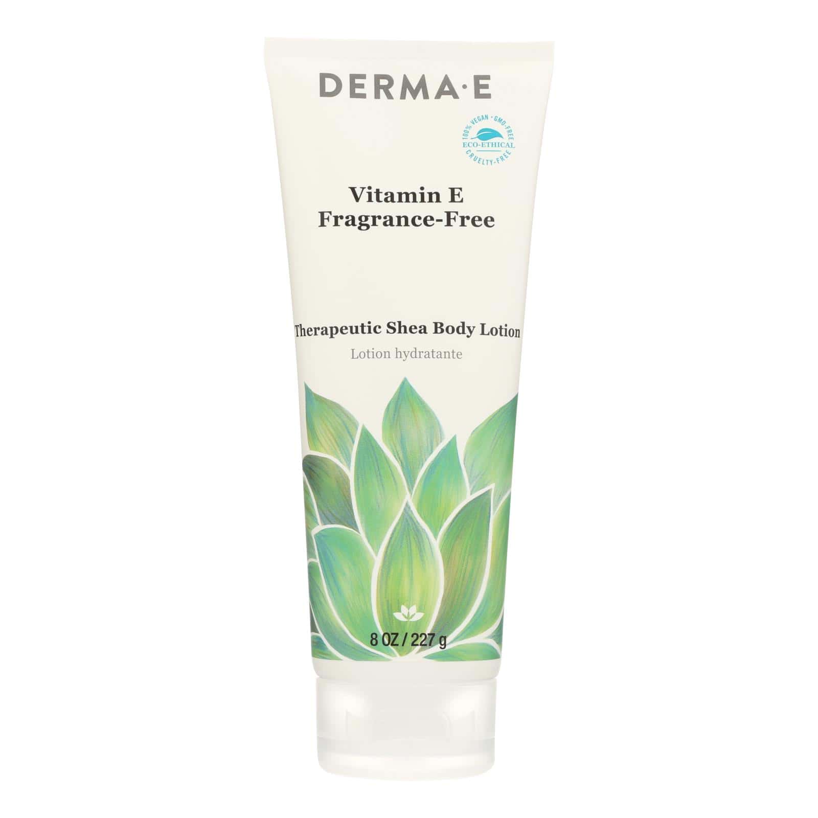 DERMA E, BODY LOTION, FRAGRANCE FREE IS ECO-ETHICAL. THIS PRODUCT IS A FRAGRANCE-FREE, THERAPEUTIC BODY MOISTURIZER THAT DRAMATICALLY SOFTENS AND CONDITIONS DRY, ROUGH, FLAKY SKIN. DERMA E, BODY LOTION, FRAGRANCE FREE IS DOCTOR-DEVELOPED WITH A HEALTHY DOSE OF ANTIOXIDANT-RICH VITAMIN E, CRANBERRY SEED AND OLIVE OILS WHICH PROVIDE NUTRIENT-RICH MOISTURE TO HELP SKIN FEEL RESTORED. DERMA E, BODY LOTION, FRAGRANCE FREE IS 100% VEGAN, CRUELTY-FREE AND DOES NOT CONTAIN GLUTEN, SOY OR GMOS AND COMES IN A 8 OZ. TUBE. SEE DRUG FACTS PANEL FOR WARNINGS.