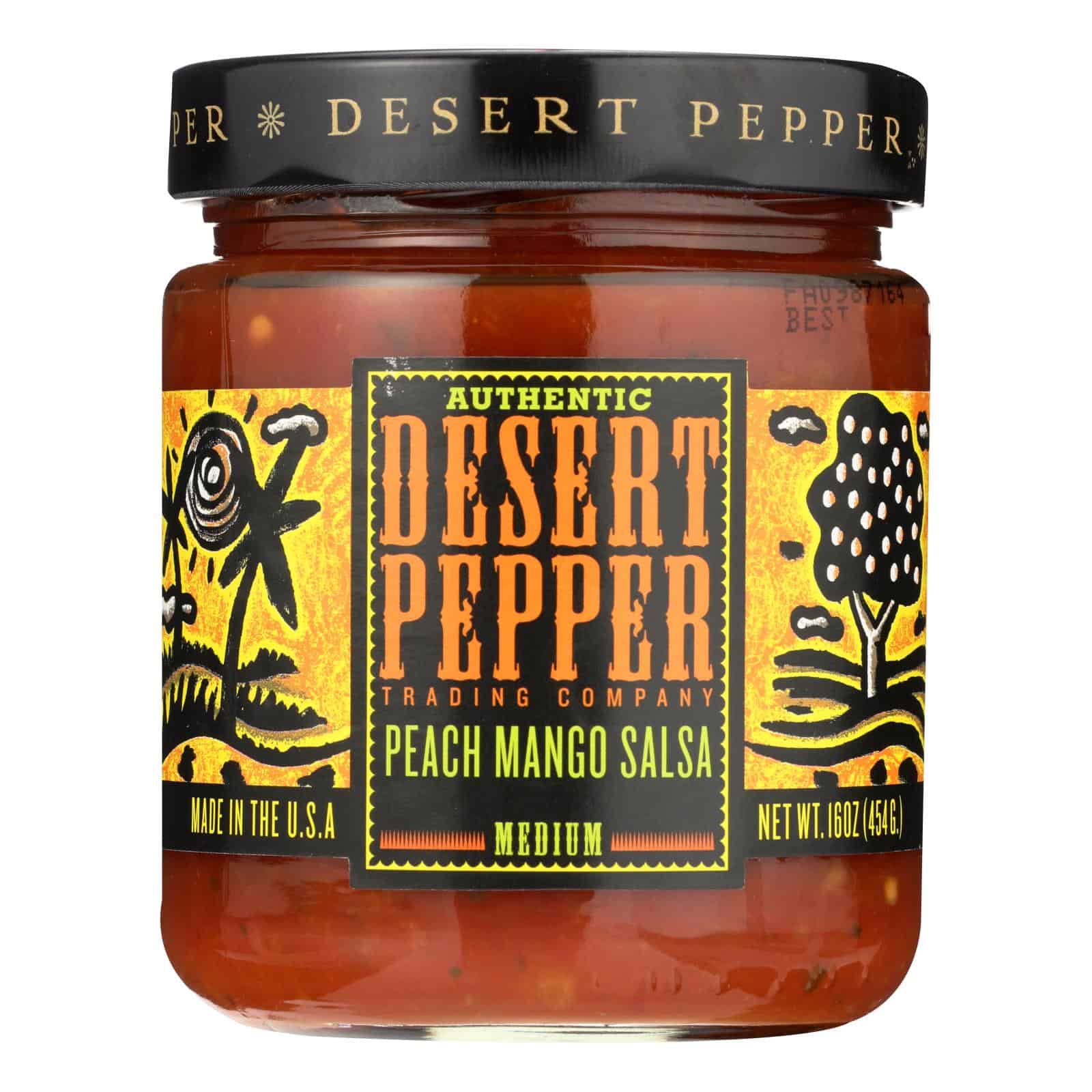DESERT PEPPER TRADING COMPANY MEDIUM PEACH MANGO SALSA DELIVERS SPICY, BRIGHT FLAVOR WHETHER YOU USE IT AS A CONDIMENT, DIP OR SAUCE INGREDIENT. AT 15 CALORIES PER SERVING, YOU CAN MIX THIS FRUITY SALSA INTO SCRAMBLED EGGS OR USE IT AS A TACO TOPPING WITHOUT HURTING YOUR DIET PLAN. THE 16 OZ. JAR YIELDS ABOUT 15 SERVINGS OF VEGAN, GLUTEN-FREE SALSA.