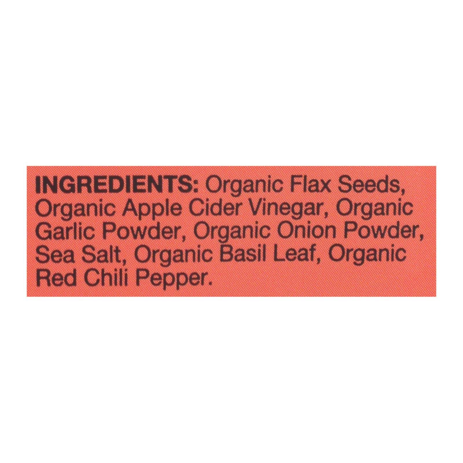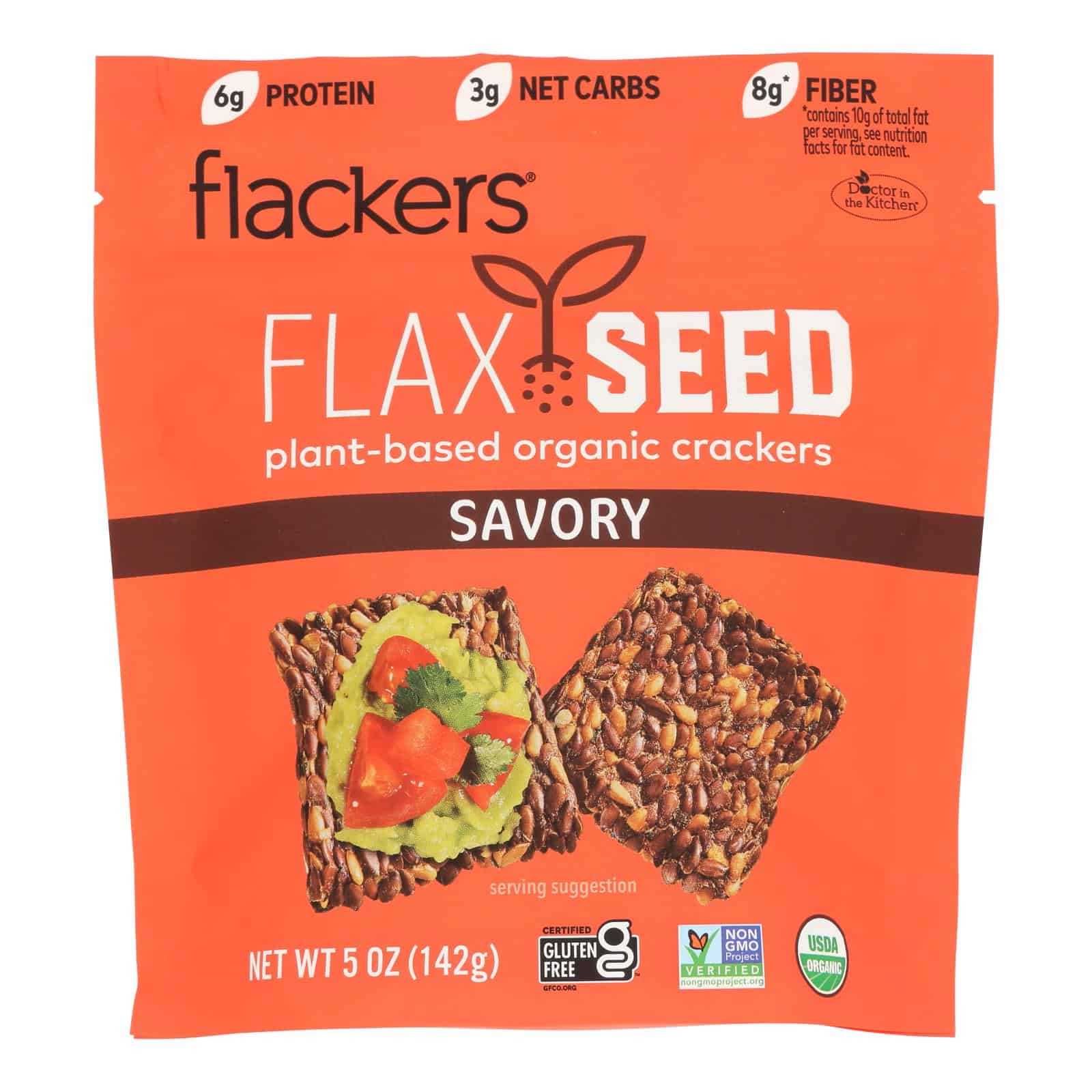FLACKER?S GARLIC ONION BASIL & RED CHILI PEPPER ORGANIC FLAX SEED CRACKERS ARE A LIGHT, NATURAL SNACK, MADE FROM ORGANIC FLAX SEEDS AND OTHER NATURAL INGREDIENTS. FLAVORED WITH A SAVORY BLEND OF HERBS, FLACKER?S ORGANIC FLAX SEED CRACKERS ARE FREE FROM HARMFUL OR UNNECESSARY ADDITIVES. WITH 6 GRAMS OF FIBER AND 4 GRAMS OF PROTEIN PER SERVING, FLACKER?S ORGANIC FLAX SEED CRACKERS ARE A GREAT SNACK TO SUPPLEMENT A HEALTHY DIET. FLACKER?S ORGANIC FLAX SEED CRACKERS WITH GARLIC, ONION, BASIL & RED CHILI PEPPER ARE KOSHER, VEGAN FRIENDLY, PALEO FRIENDLY, CERTIFIABLY NON-GMO AND GLUTEN-FREE. EACH BAG CONTAINS 5 SERVINGS, WITH 100 CALORIES PER SERVING. SEE NUTRITION FACTS PANEL FOR ALLERGENS. INCLUDES ONE 5 OZ. BAG OF FLACKER?S GARLIC ONION BASIL & RED CHILI PEPPER ORGANIC FLAX SEED CRACKERS.