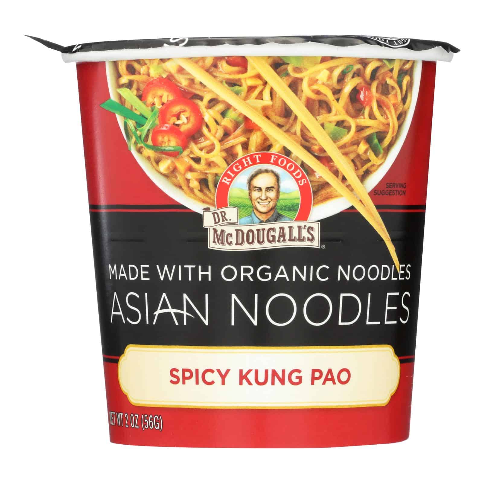 DR. MCDOUGALL?S ASIAN NOODLE SOUP, SPICY KUNG-PAO IS A HEALTHY, DELICIOUS AND CONVENIENT MEAL OPTION. MADE WITH NATURAL INGREDIENTS, THIS SOUP IS FREE OF UNNATURAL AND UNNECESSARY ADDITIVES. THIS PRODUCT IS GLUTEN-FREE, NON-GMO AND VEGAN FRIENDLY. EACH CUP OF DR. MCDOUGALL?S ASIAN NOODLE SOUP, SPICY KUNG-PAO WEIGHS 2 OZ. WITH 110 CALORIES PER SERVING. SEE NUTRITION FACTS PANEL FOR ALLERGENS.