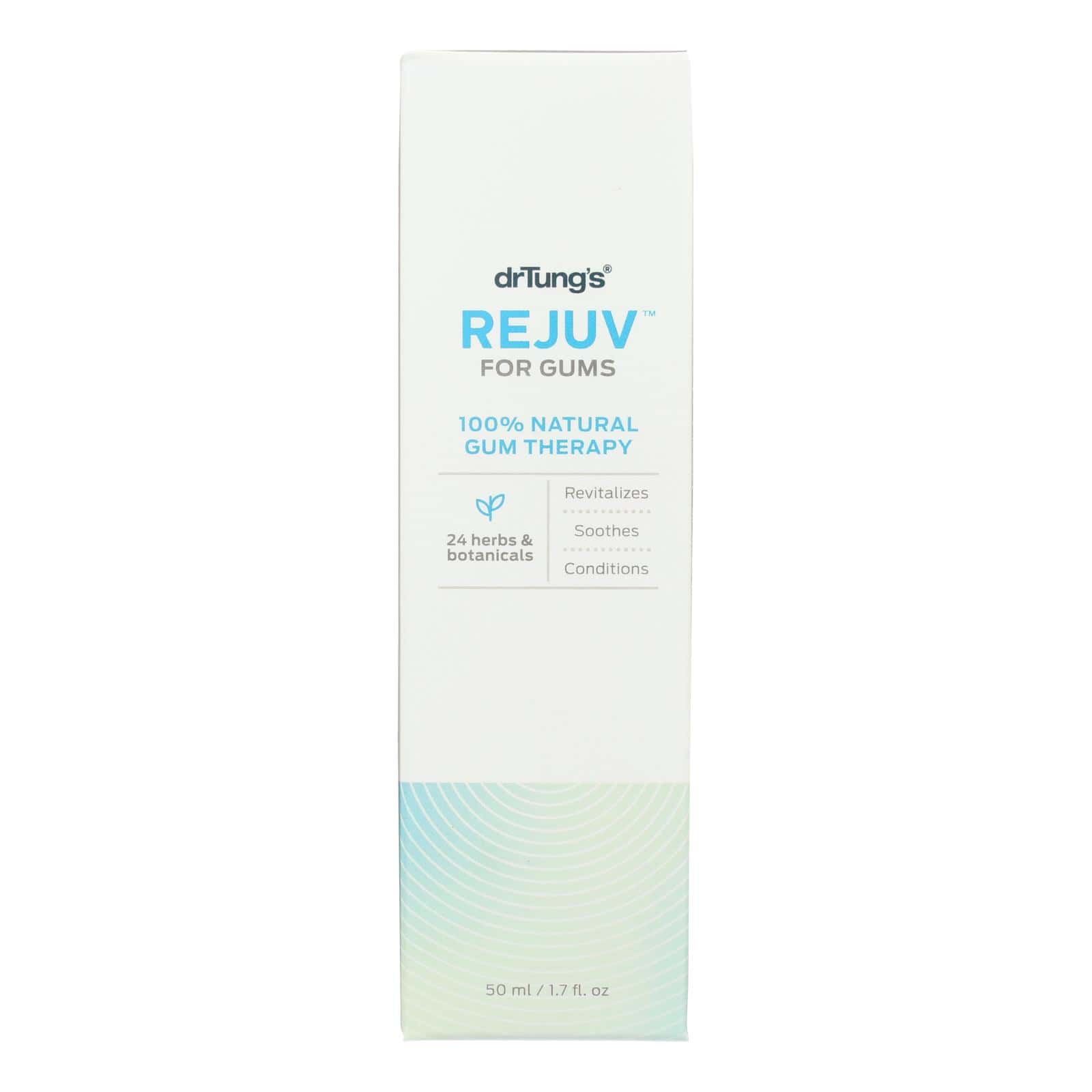 DRTUNG’S REJUV FOR GUMS 100% NATURAL GUM THERAPY IS FORMULATED TO SOOTHE, REVITALIZE AND CONDITION RECEDING GUMS. THIS SUGAR- AND ALCOHOL-FREE LIQUID MOUTHWASH ENHANCES YOUR ORAL HYGIENE AND CARES FOR YOUR GUMS THE SAME WAY MOTHER NATURE WOULD USING 24 HERBS AND BOTANICALS. USE THE EEZI-SQUEEZE DROPPER ON THE 1.7 FL. OZ. BOTTLE TO EASILY DISPENSE THE REQUIRED AMOUNT. MASSAGE AFFECTED AREAS, OR SWISH A FEW DROPS IN THE MOUTH AFTER MEALS AND BEFORE GOING TO BED. DO NOT INGEST.
