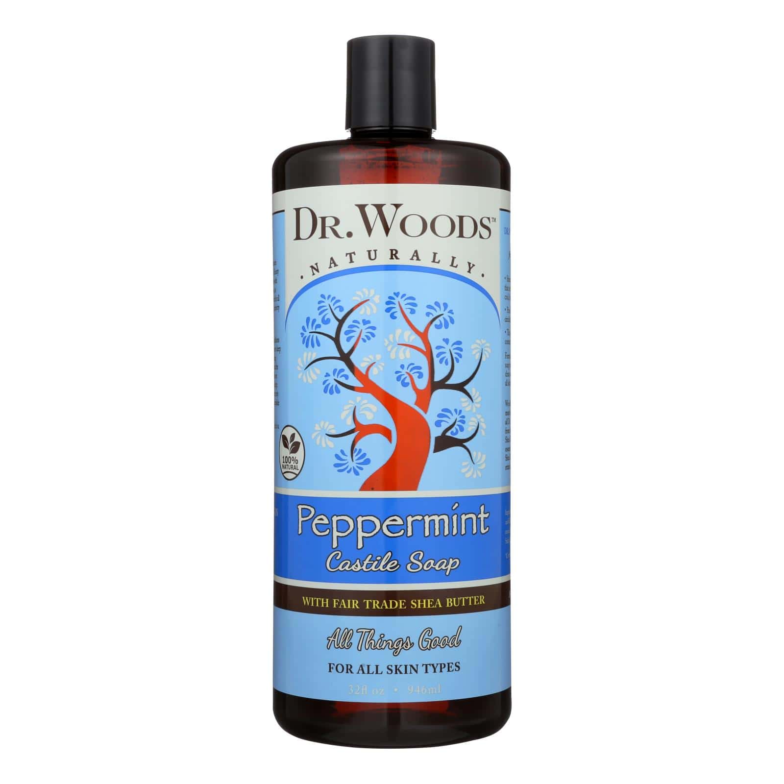 DR. WOODS CASTILE SOAP FOR ALL SKIN TYPES, PEPPERMINT IS AN EXTRA GENTLE AND LUXURIOUS SOAP. MADE WITH NATURALLY DERIVED INGREDIENTS AND TRADITIONAL METHODS, THIS SOAP IS FREE OF UNNATURAL AND UNNECESSARY ADDITIVES. THIS PRODUCT IS GLUTEN-FREE, CRUELTY-FREE AND VEGAN FRIENDLY. EACH BOTTLE OF DR. WOODS CASTILE SOAP FOR ALL SKIN TYPES, PEPPERMINT CONTAINS 32 FL. OZ. OF SOAP. SEE LABEL FOR WARNINGS.