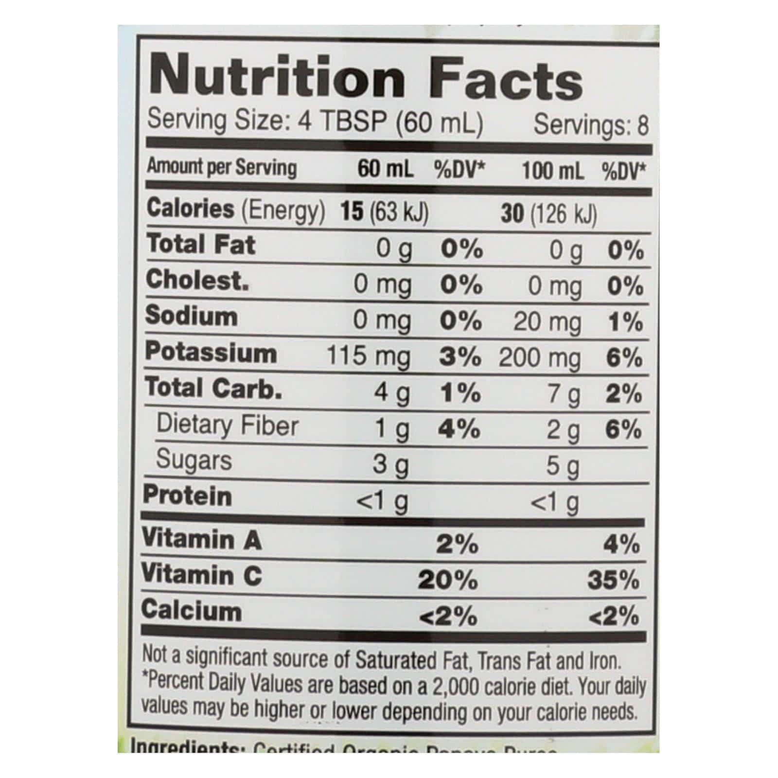 DYNAMIC HEALTH ORGANIC PAPAYA PUREE IS FAT-FREE AND MADE WITHOUT ADDED SUGARS, SO IT’S A GREAT ADDITION TO YOUR HEALTH-CONSCIOUS REFRIGERATOR. SIMPLY MIX ONE PART PUREE INTO SELTZER, JUICE OR WATER FOR A REFRESHING BEVERAGE, OR ADD IT TO SMOOTHIES AND COCKTAILS FOR A BURST OF NATURAL FRUIT FLAVOR. THIS 16 FL. OZ. BOTTLE CONTAINS APPROXIMATELY EIGHT SERVINGS AND THE TWIST-TOP ALLOWS EASY CLOSURE.