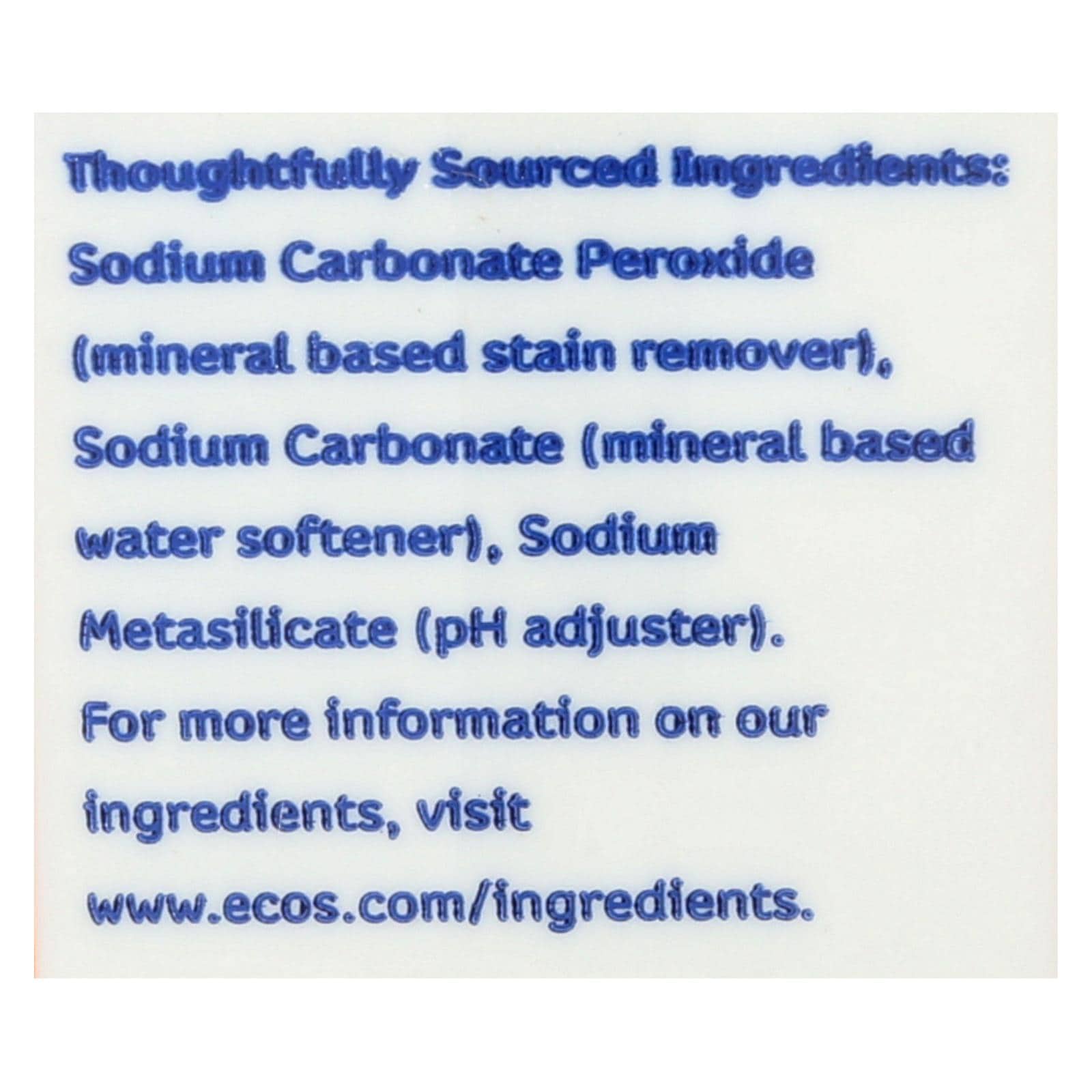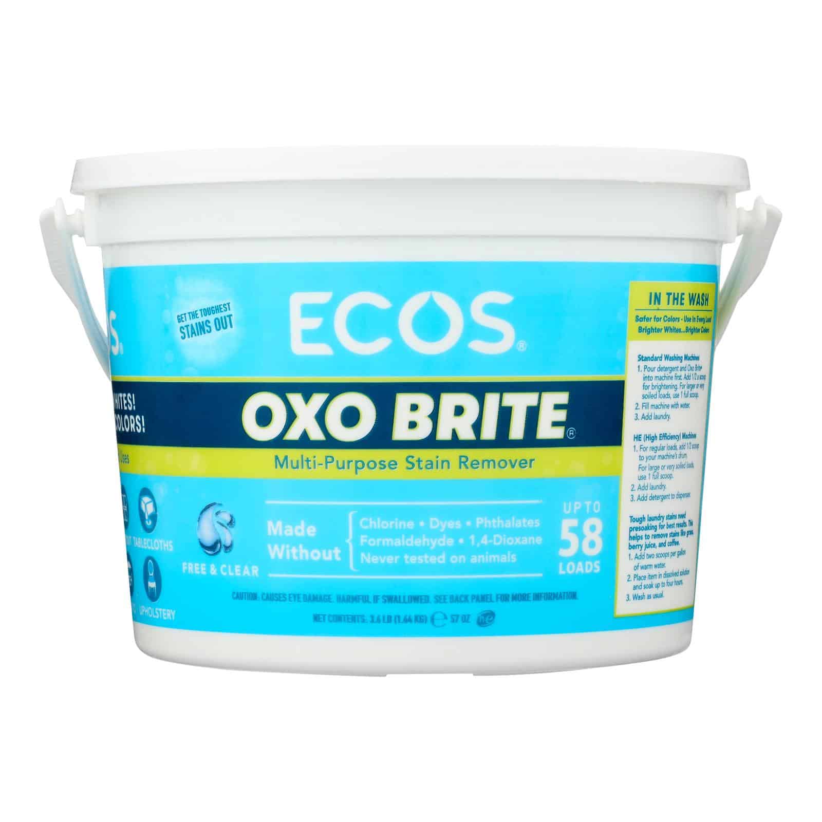 ECOS OXO-BRITE MULTI-PURPOSE STAIN REMOVER, LAUNDRY & HOUSEHOLD USE IS EXTRAORDINARILY EFFECTIVE AND CONCENTRATED WITH MINERAL BASED POWER. EACH SCOOP GIVES YOU EXTRA-STRENGTH CLEANING THAT’S SAFER FOR YOUR FAMILY WITH NO PHOSPHATES, NO CHLORINE AND NO BLEACH. THIS PRODUCT HAS HUNDREDS OF USES INCLUDING CARPET STAINS AND ODORS, UPHOLSTERY, GROUT, CALCIUM BUILDUP, DECKS, OUTDOOR FURNITURE, BATHROOM SURFACES AND PET MESSES. THIS OXYGEN CLEANER COMES IN A 3.6 LB. TUB. SEE THE FACTS LABEL FOR WARNINGS AND ALLERGENS.