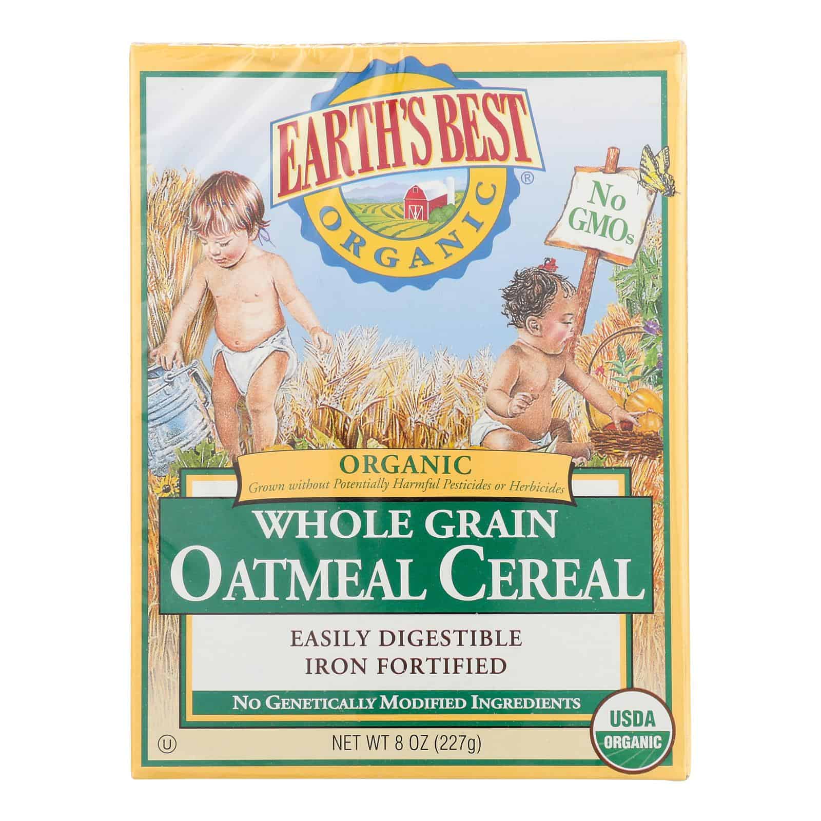 EARTH’S BEST ORGANIC WHOLE GRAIN OATMEAL CEREAL IS MADE WITH ORGANIC WHOLE GRAIN OAT FLOUR WHICH IS GROWN WITHOUT HARMFUL PESTICIDES OR HERBICIDES. OUR INGREDIENTS ARE NOT GENETICALLY ENGINEERED. WE FORTIFY EACH SERVING WITH 45% OF YOUR CHILD?S DAILY RECOMMENDED VALUE OF IRON AND 15% OF YOUR CHILD?S DAILY VALUE OF ZINC PER SERVING. THIS EASILY DIGESTIBLE CEREAL IS UNSALTED, UNSWEETENED, AND MADE WITHOUT ANY ARTIFICIAL COLORS OR PRESERVATIVES. INCLUDES ONE 8 OZ. BOX OF EARTH?S BEST ORGANIC WHOLE GRAIN OATMEAL CEREAL. SEE NUTRITION FACTS PANEL FOR ALLERGEN INFORMATION. FROM THE DAY THAT EARTH?S BEST WAS FOUNDED IN 1985, WE?VE BEEN RECOGNIZED AS A BRAND DEDICATED TO OFFERING WHOLESOME, SAFE PRODUCTS FOR LITTLE ONES. WE BELIEVE THAT BABIES DESERVE NUTRITIOUS FRUITS HANDPICKED FROM ORGANIC ORCHARDS, VEGETABLES GROWN IN NATURE?S SOIL, AND FOODS THAT ARE MADE WITHOUT GENETICALLY ENGINEERED INGREDIENTS.