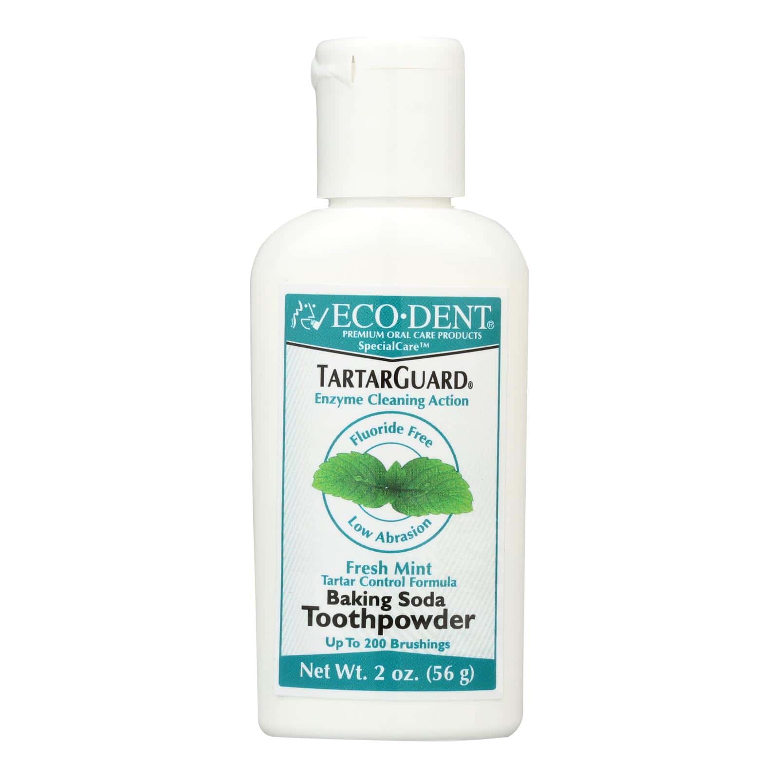 ECO-DENT SPECIALCARE TARTARGUARD BAKING SODA TOOTH POWDER IN FRESH MINT HELPS TO PREVENT AND REDUCE TARTAR BUILDUP WHILE LEAVING BEHIND A COOL MINT FLAVOR THAT FRESHENS BREATH. THE 2 OZ. BOTTLE HAS ENOUGH PRODUCT FOR UP TO 200 USES. THE POWDER FEATURES EFFERVESCENCE AND A LOW-ABRASION TEXTURE THAT PROTECTS TOOTH ENAMEL. BAKING POWDER, KNOWN FOR ITS EXCEPTIONAL CLEANING ABILITY, GENTLY REMOVES PLAQUE AND STAINS. ESSENTIAL OILS DELIVER THE GREAT MINT TASTE.