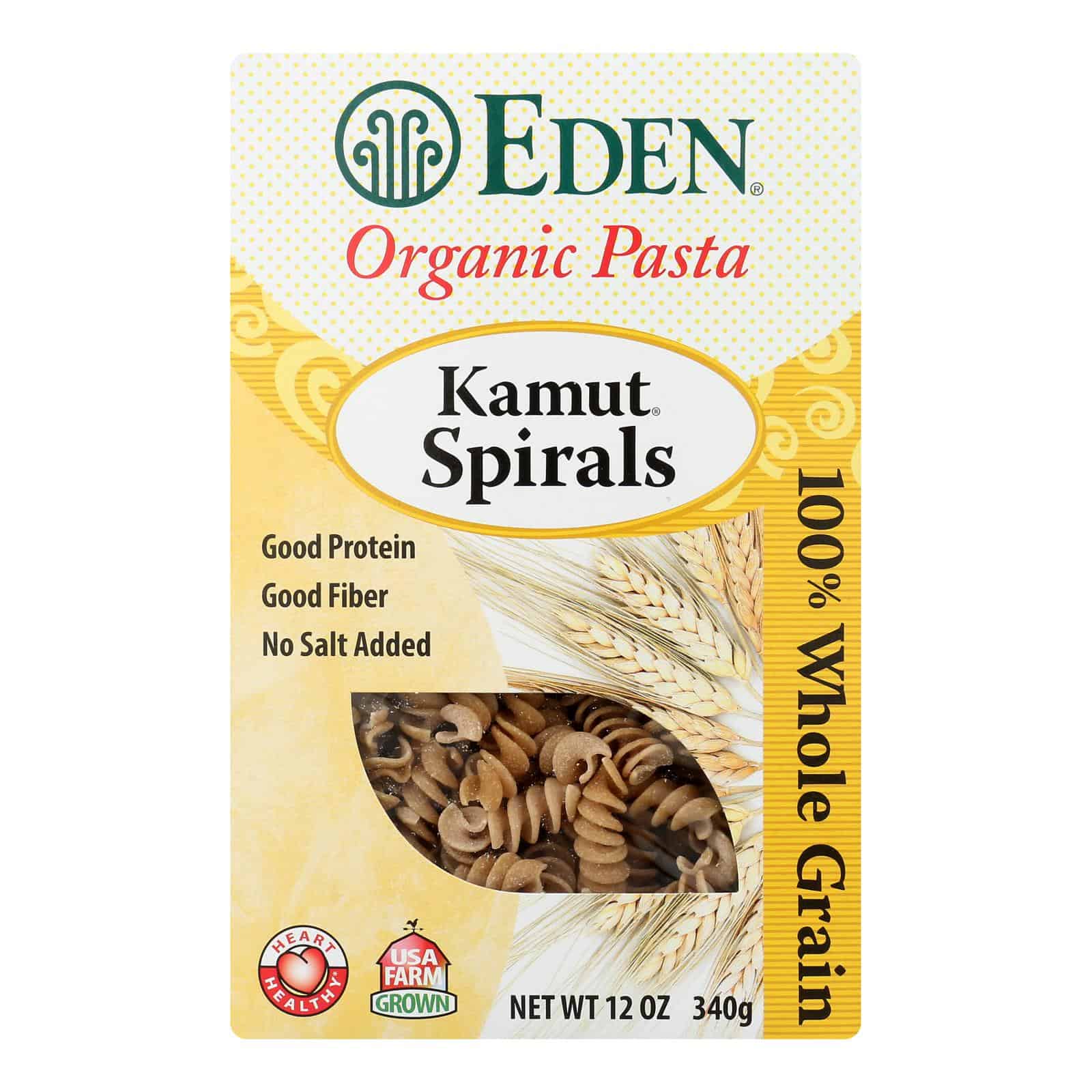 EDEN WHOLE KAMUT SPIRALS ARE HIGH IN FIBER AND PROTEIN, HEART HEALTHY AND MADE WITH WHOLE GRAINS. A 1-CUP SERVING PROVIDES 10 G. OF PROTEIN, 6 G. OF DIETARY FIBER AND 20% EACH OF THE DAILY RECOMMENDED VALUES OF MAGNESIUM AND PHOSPHORUS. EVERY 12 OZ. BOX OF WHOLE KAMUT SPIRALS IS CERTIFIED KOSHER-PARVE AND OCIA ORGANIC CERTIFIED.