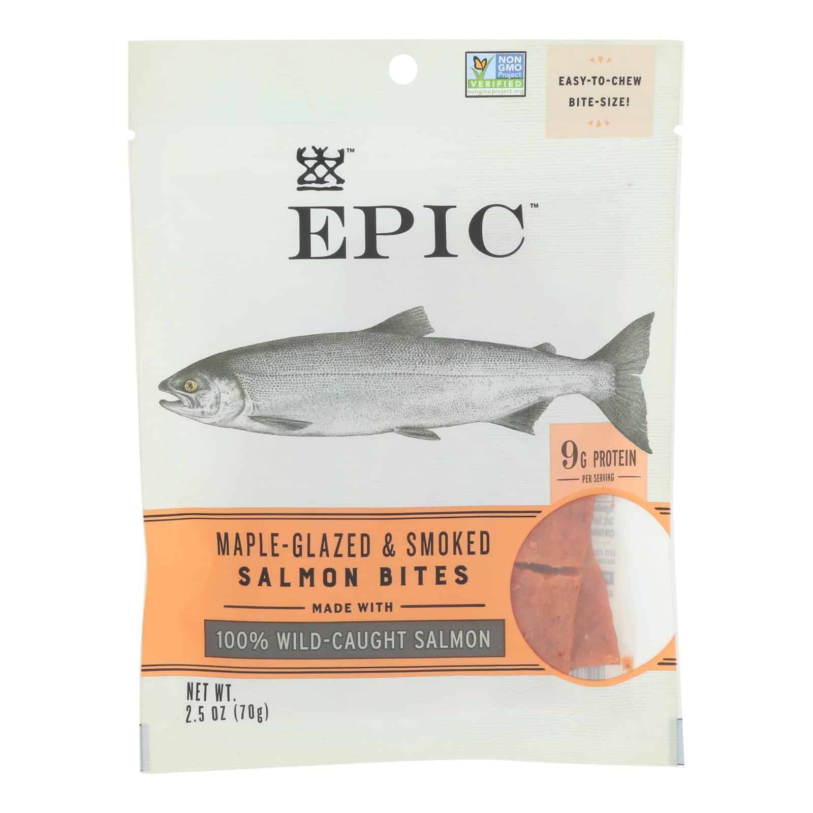 EPIC PROTEIN BITES, SALMON MAPLE DILL IS A CONVENIENT PACKAGE OF BITE-SIZED PROTEIN SNACKS THAT TASTE EPIC. THIS PACKET CONTAINS WILD CAUGHT SALMON, COCONUT OIL, MAPLE SUGAR AND SEASONINGS. EACH BAG CONTAINS 2.5 OZ. OF GLUTEN-FREE SALMON WITH 14 G. OF PROTEIN PER SERVING, AND IS A GOOD WAY TO BOOST YOUR PROTEIN INTAKE.