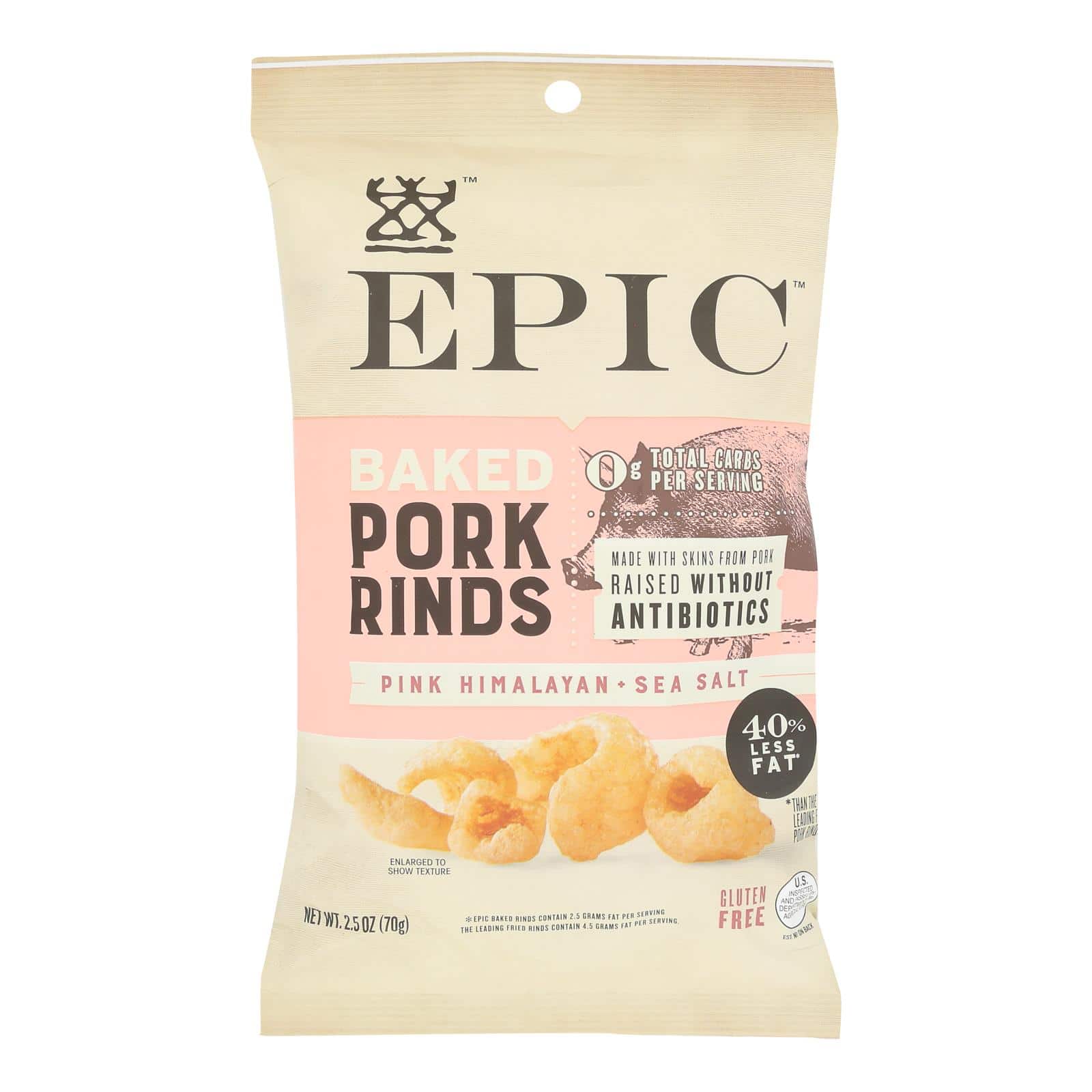 EPIC OVEN BAKED PORK RINDS OFFER A LOWER FAT ALTERNATIVE TO TRADITIONAL FRIED PORK RINDS WHILE RETAINING ALL THE CRUNCHINESS AND GREAT FLAVOR OF THE ORIGINAL. WE DERIVE OUR PORK FROM PIGS THAT HAVE NOT RECEIVED ANTIBIOTICS, AND BAKE THEM AND SEASON THEM WITH PINK HIMALAYAN AND SEA SALT. THIS GLUTEN-FREE SNACK COMES IN A 2.5 OZ. BAG. ENJOY A SERVING AS A SIDE WITH YOUR FAVORITE WRAP OR SANDWICH, OR SIMPLY EAT THEM ALONE WHEN YOU HAVE A CRAVING FOR SOMETHING SALTY.