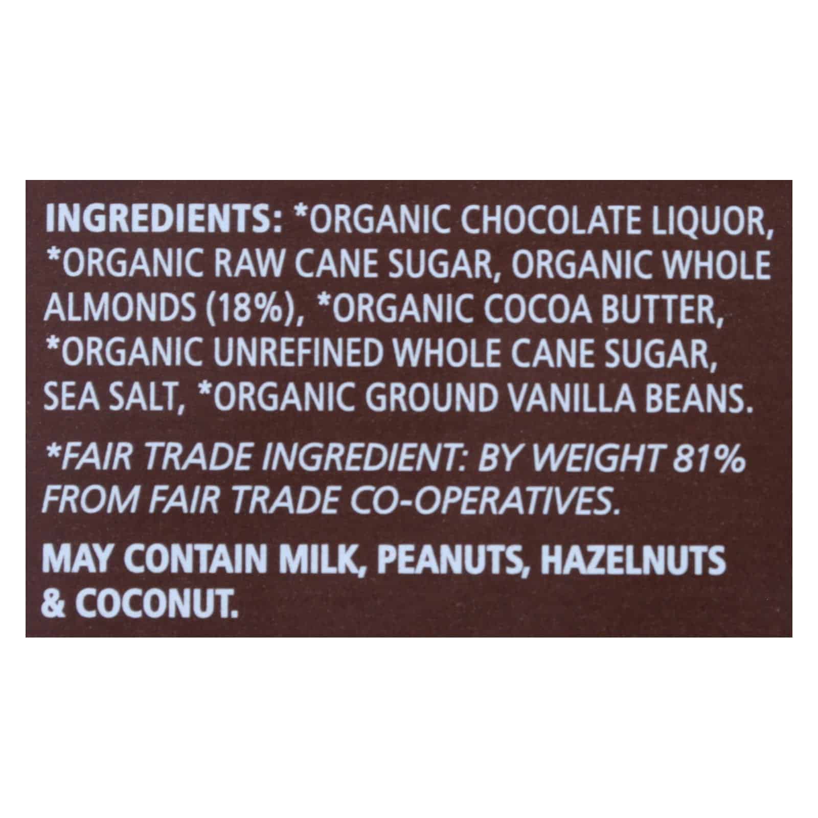 Organic & fairly traded. USDA Organic. Certified by Oregon Tilth. Whole Almonds. Always small farmer grown. At Equal Exchange, we work we source cacao from small farmer organizations because we believe they are the heart and soul of the Fair Trade movement. Certified in Switzerland. www.equalexchange.coop. Worker-owned cooperative. Country of Origin: Switzerland.