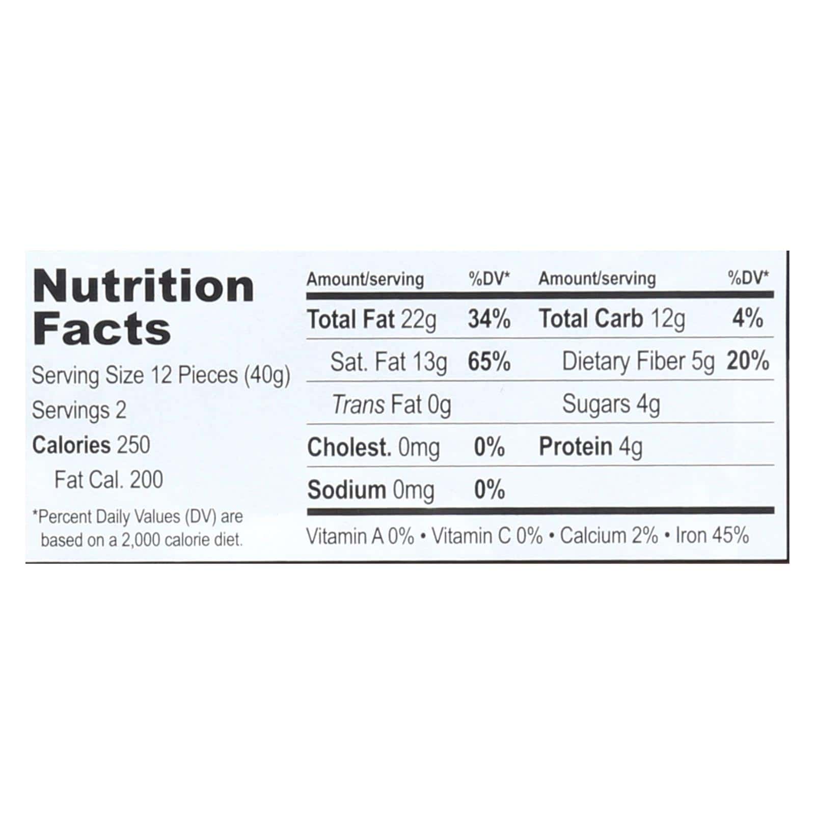 SMALL FARMER CHOCOLATE BAR, EXTREME DARK CHOCOLATE IS A RICH AND LUXURIOUS CHOCOLATE BAR. MADE WITH NATURAL INGREDIENTS, THIS CHOCOLATE IS FREE OF UNNATURAL AND UNNECESSARY ADDITIVES. THIS PRODUCT IS KOSHER AND ORGANIC. EACH SMALL FARMER CHOCOLATE BAR, EXTREME DARK CHOCOLATE WEIGHS 2.8 OZ. WITH TWO SERVINGS PER BAR AND 250 CALORIES PER SERVING.