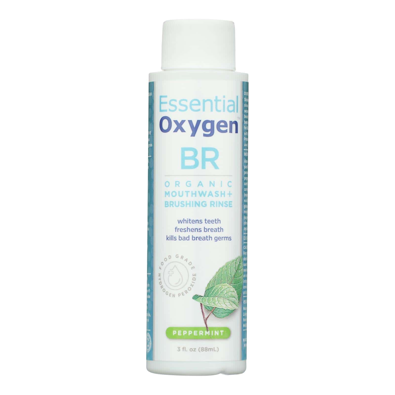 ESSENTIAL OXYGEN, BRUSHING RINSE, PEPPERMINT IS CERTIFIED USDA ORGANIC. THIS PRODUCT IS A NEW SUPERPOWER FORMULA THAT WORKS FOR WHITER TEETH, FRESHER BREATH AND HEALTHIER GUMS. ESSENTIAL OXYGEN, BRUSHING RINSE, PEPPERMINT CONTAINS 3 FL. OZ. OF PRODUCT AND DOES NOT CONTAIN SLS, ALCOHOL, GLYCERIN, PESTICIDES OR FLUORIDE. THIS PRODUCT IS NOT INTENDED TO DIAGNOSE, TREAT, CURE, OR PREVENT ANY DISEASE.