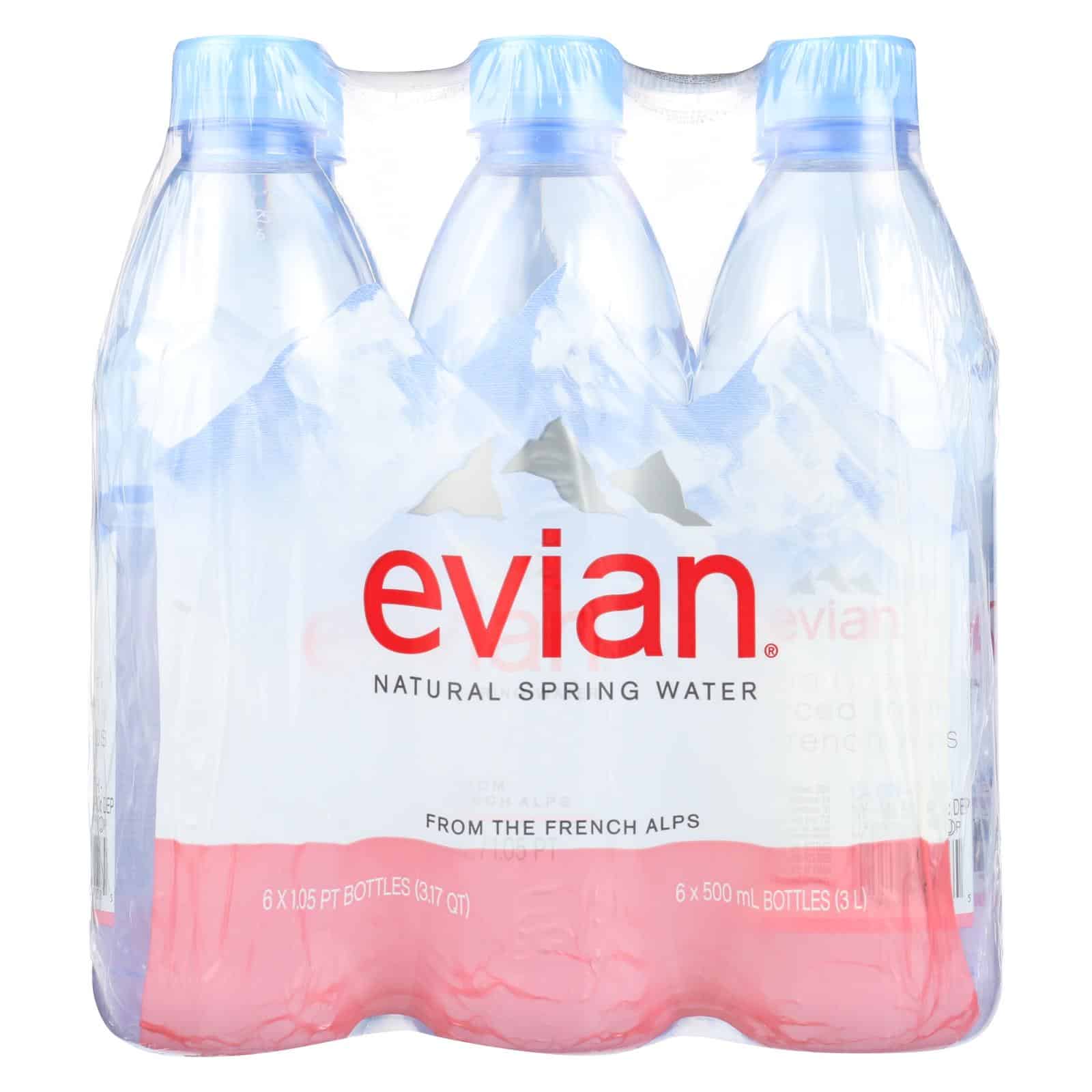 EVIAN SPRING WATER IS A NATURAL PRODUCT. THIS SPRING WATER COMES PACKAGED IN SIX 1.05 PT. BOTTLES, AND IT CONTAINS CALCIUM, MAGNESIUM, POTASSIUM, SILICA, BICARBONATES, SULFATES AND CHLORIDES. THIS SPRING WATER IS A PRODUCT OF FRANCE, HAS NATURALLY OCCURRING ELECTROLYTES AND HAS A NEUTRALLY BALANCED PH OF 7.2.